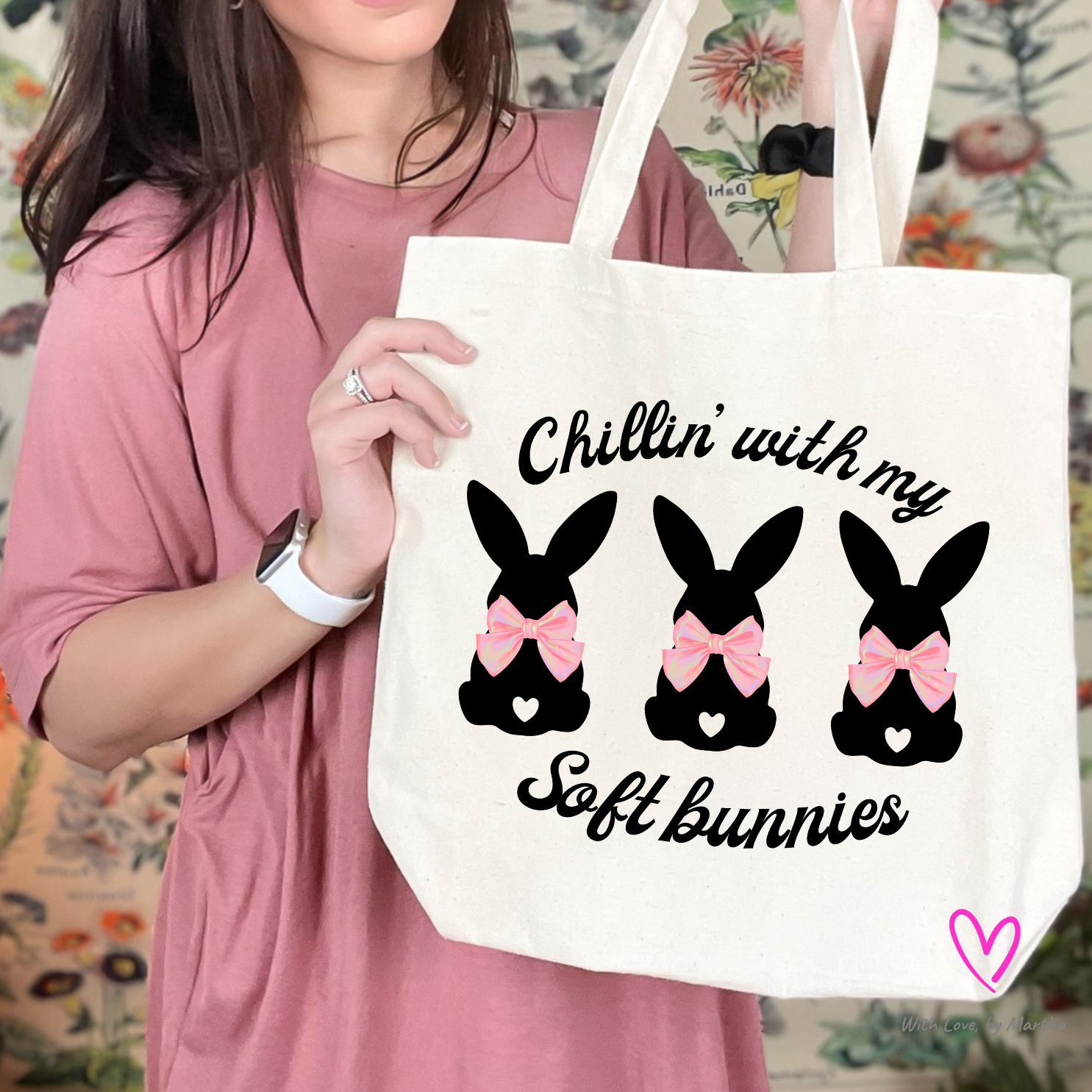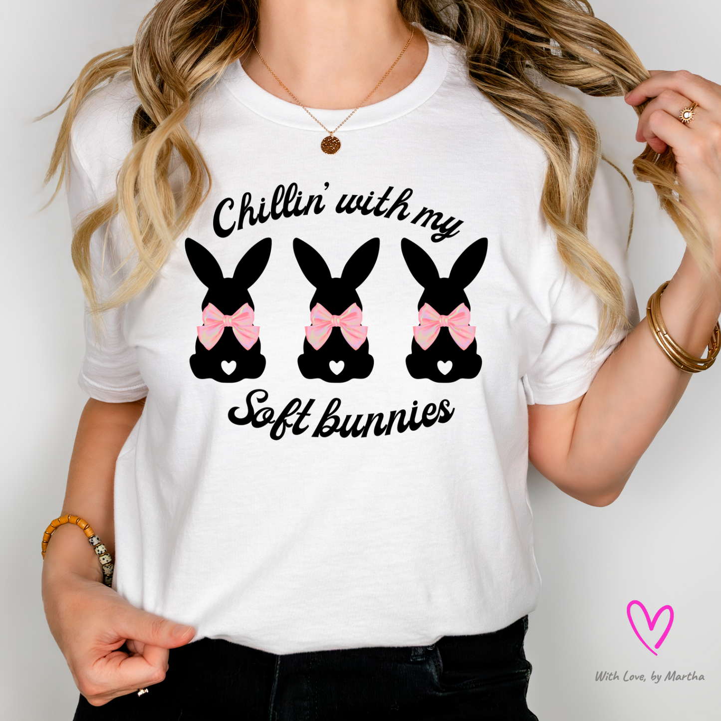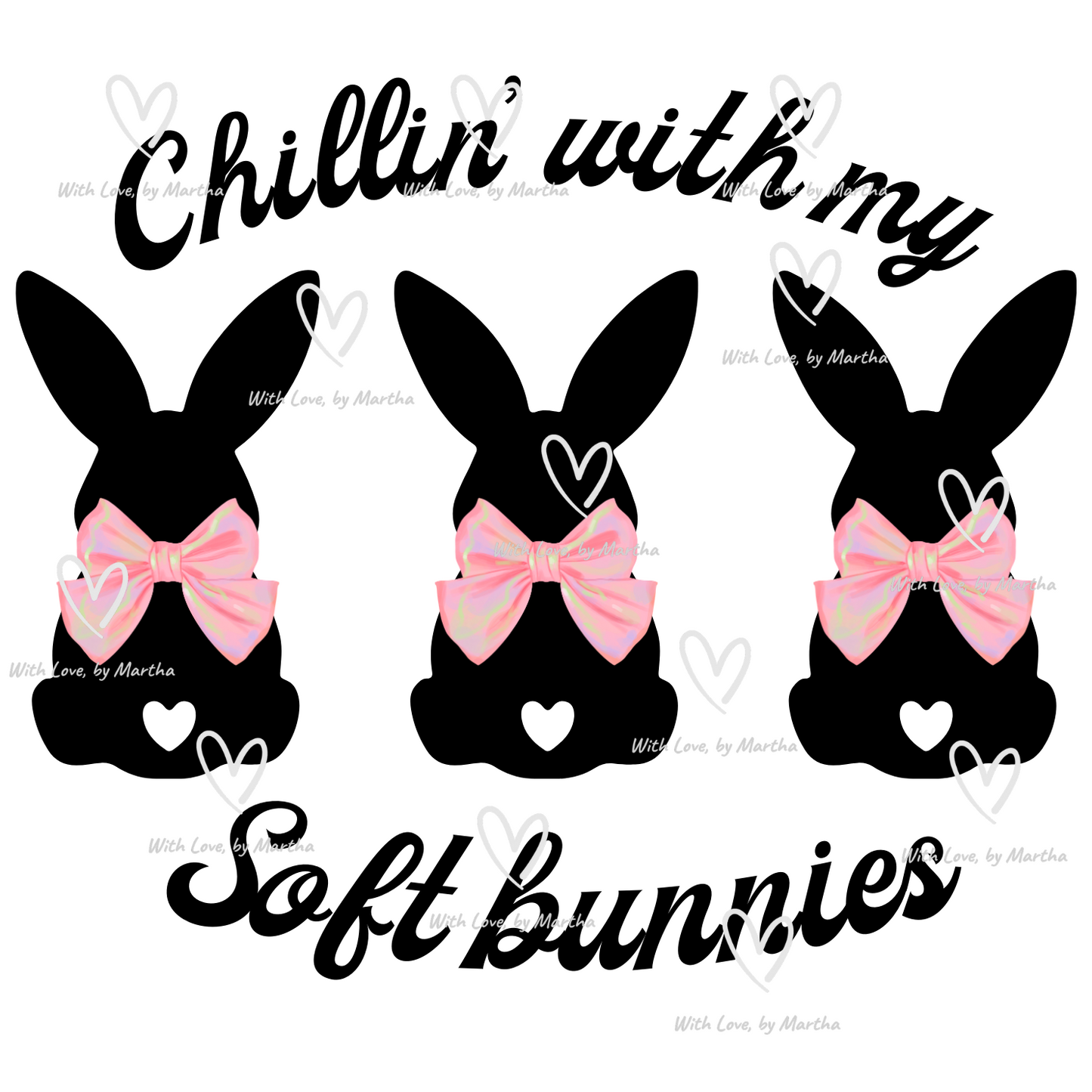 This adorable digital file is perfect for for the soft girl era theme in Easter bunnies. It has a coquette vibe of cute sassy easter bunnies. It reads "Chillin' with my soft bunnies."