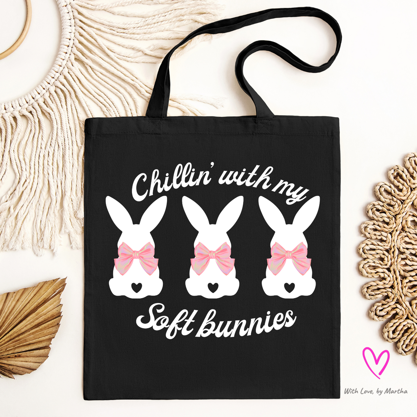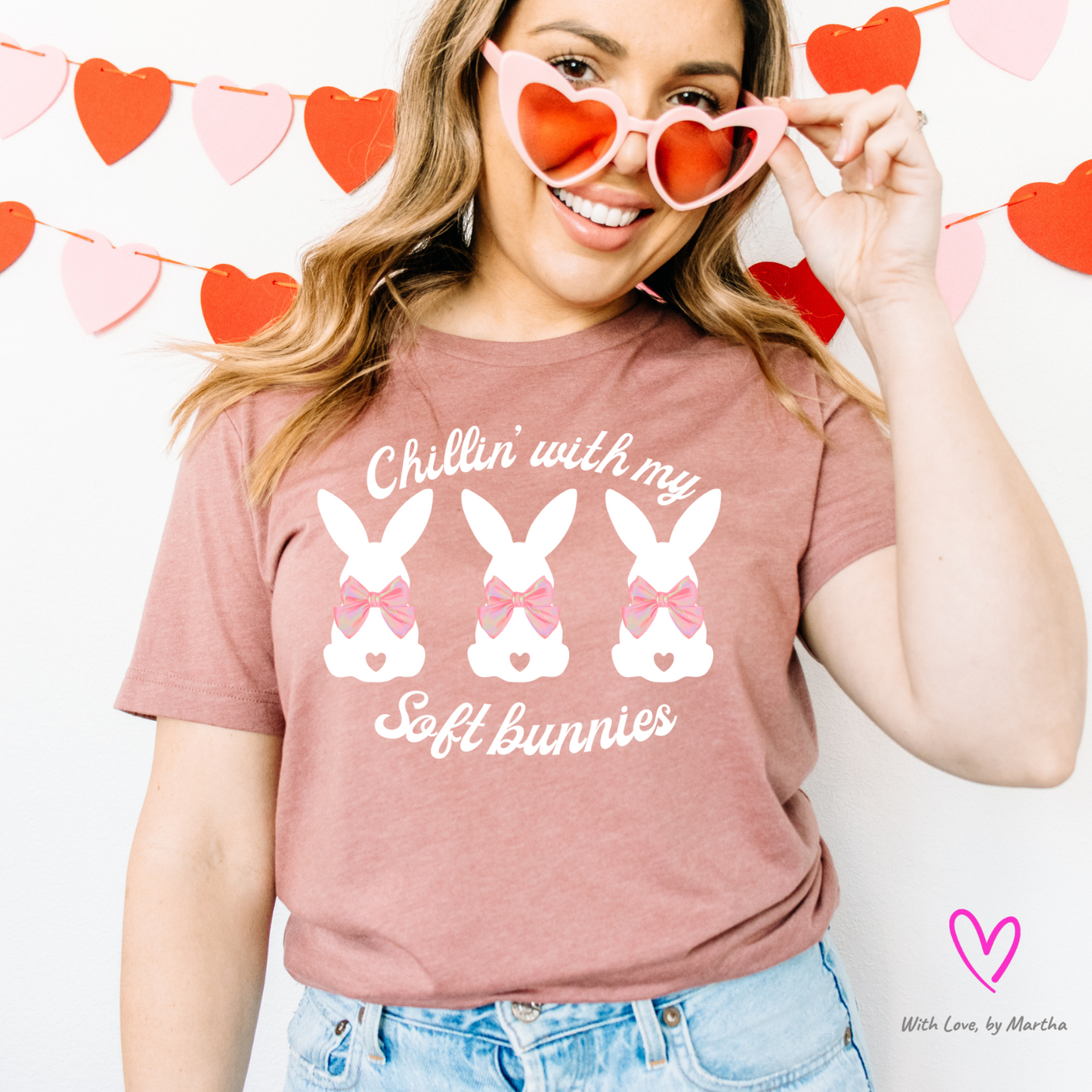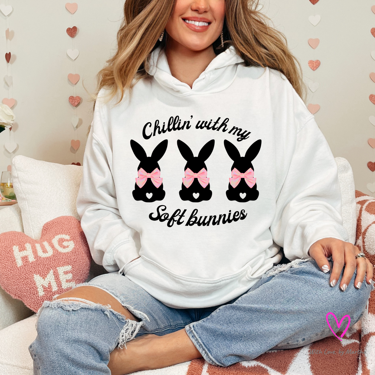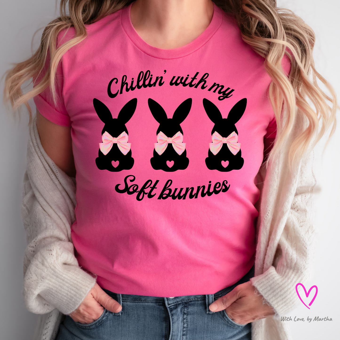 This adorable digital file is perfect for for the soft girl era theme in Easter bunnies. It has a coquette vibe of cute sassy easter bunnies. It reads "Chillin' with my soft bunnies."