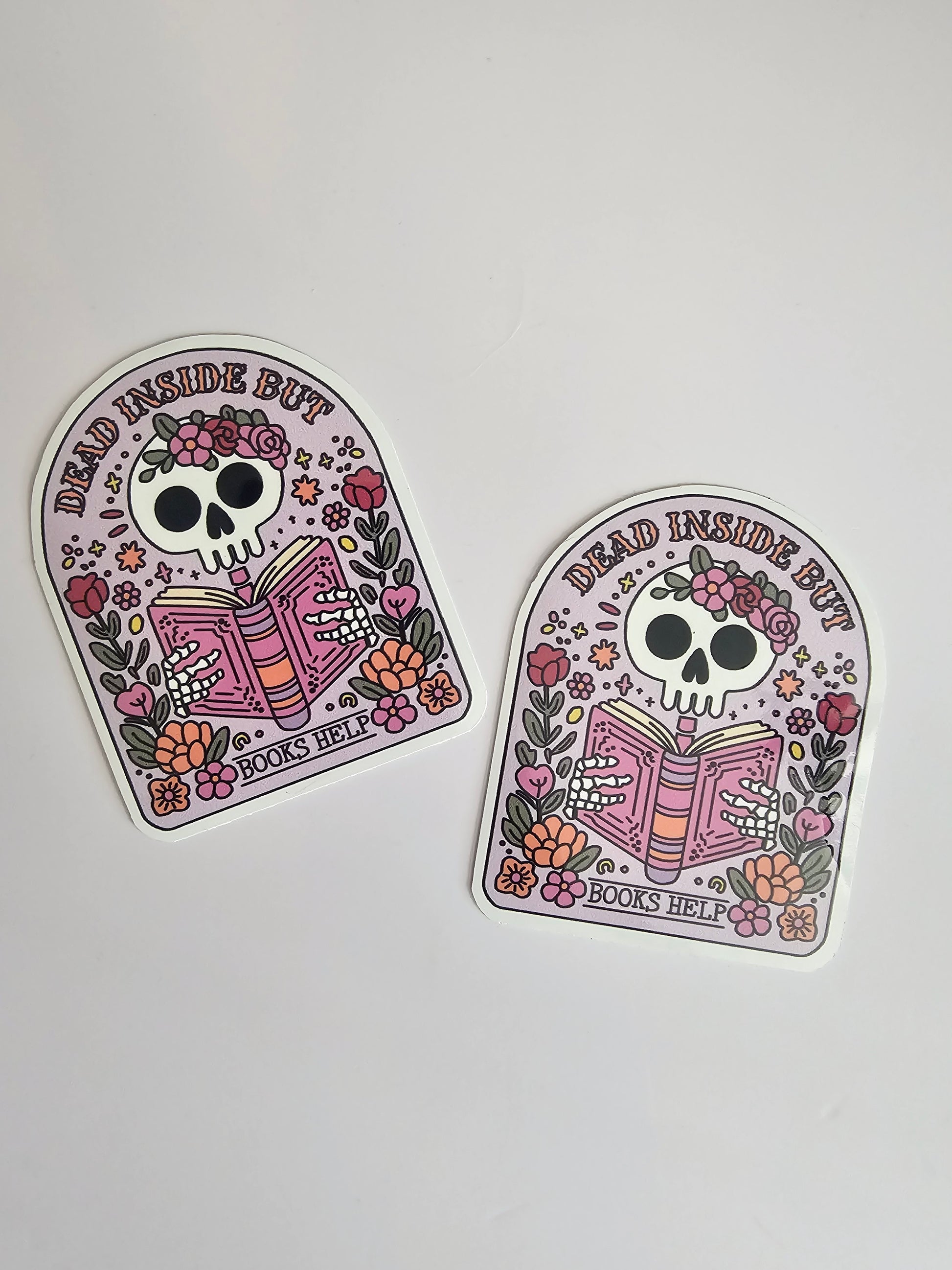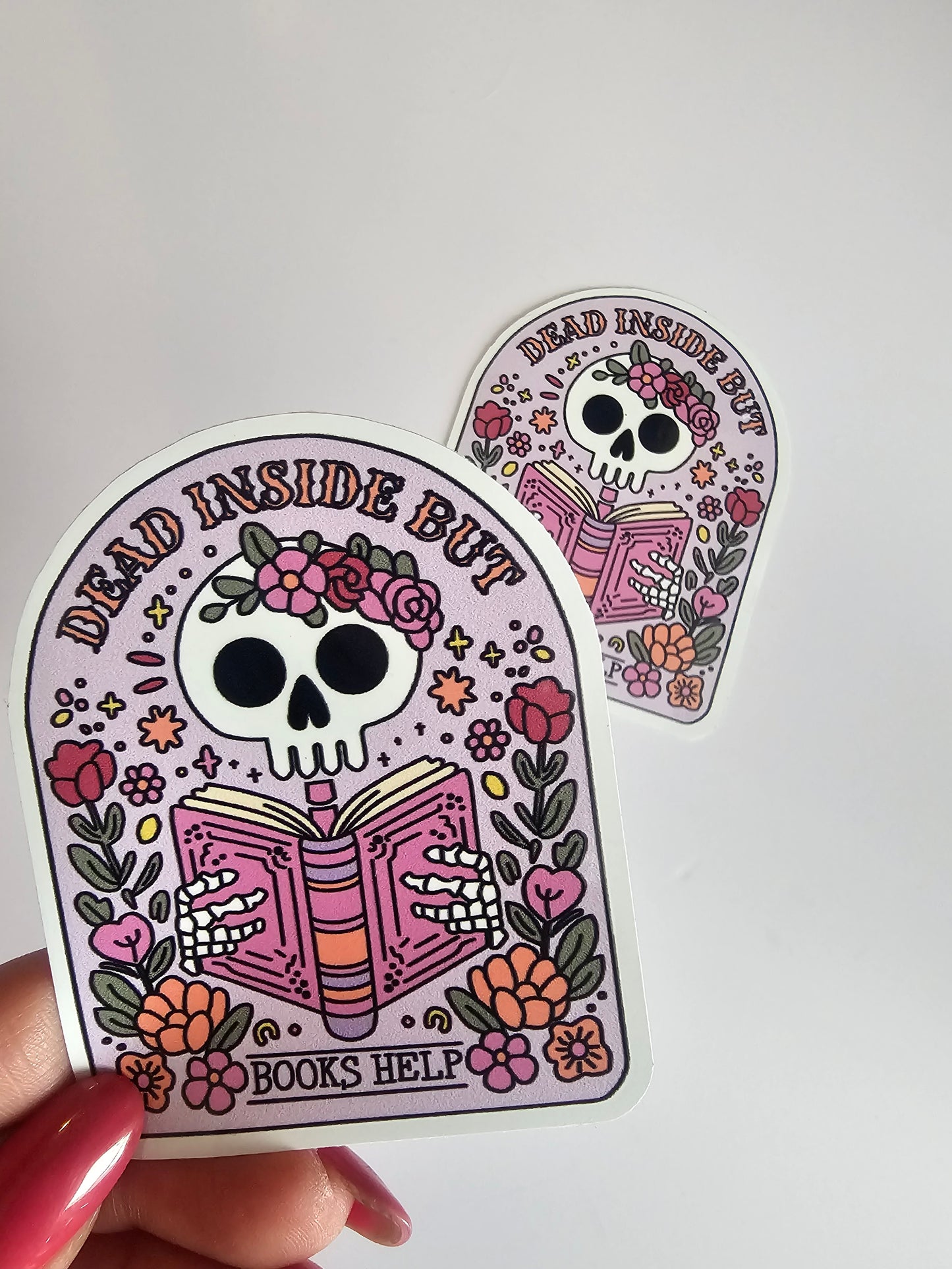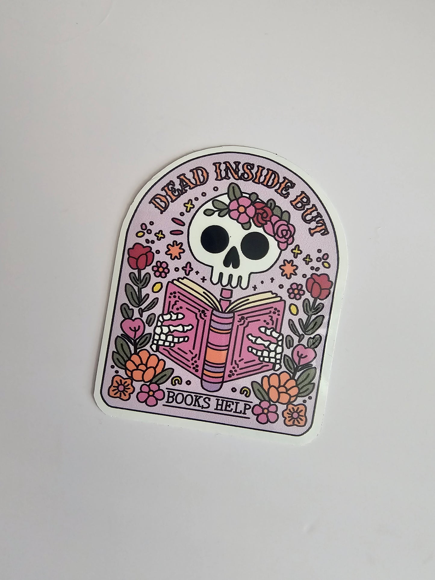This is a vinyl sticker that reads "Dead Inside but books help."
