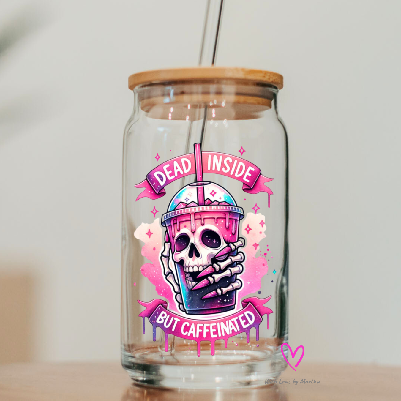 These glass cans are decorated with UVDTF, a highly durable decal that is water resistant and very durable with proper care.