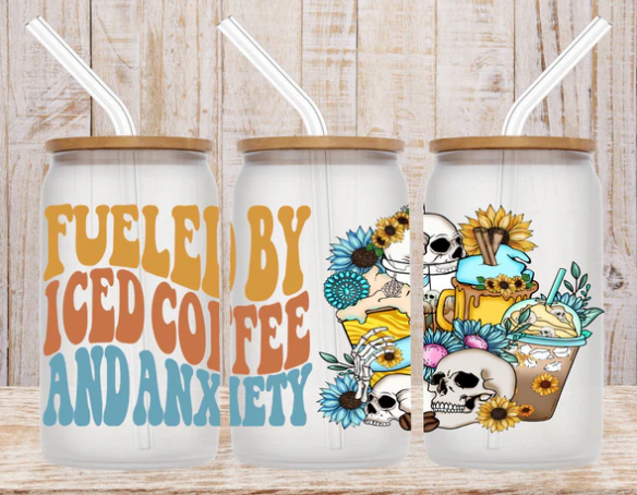"Fueled by Iced Coffee and Anxiety" Glass Can 16oz