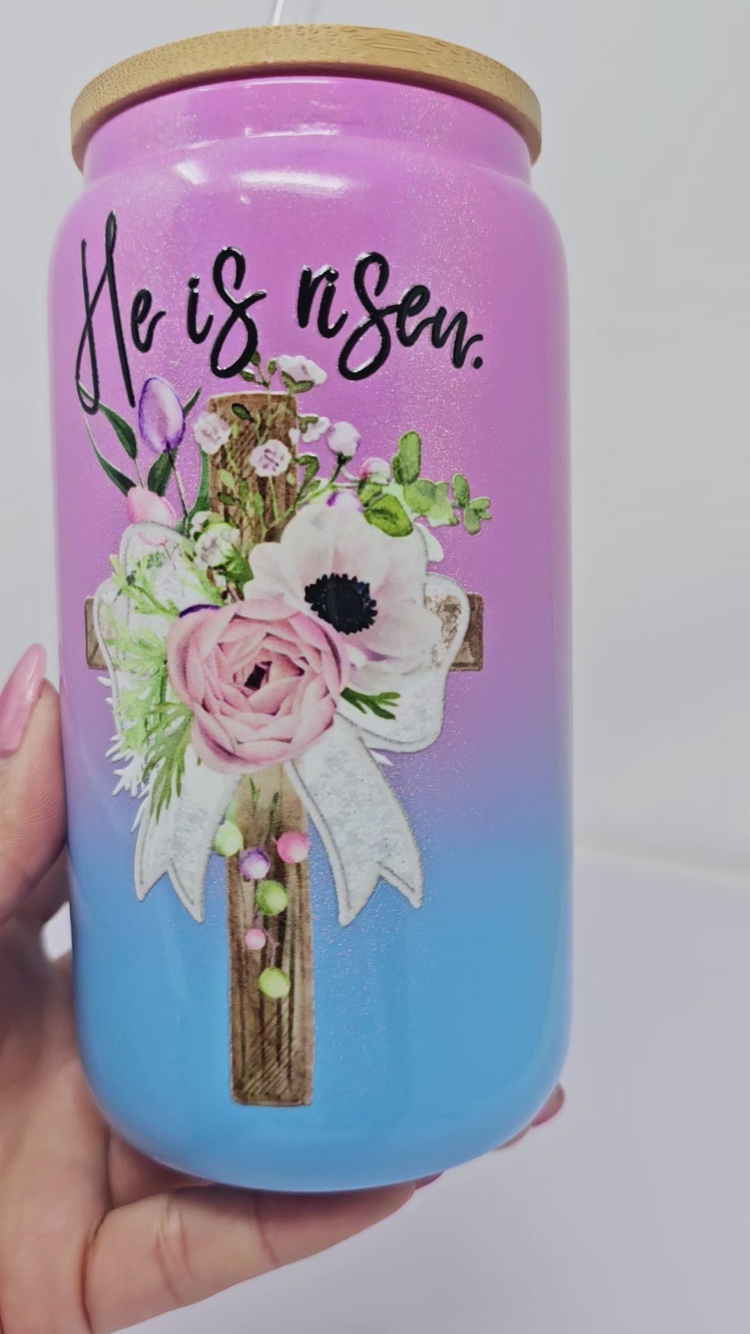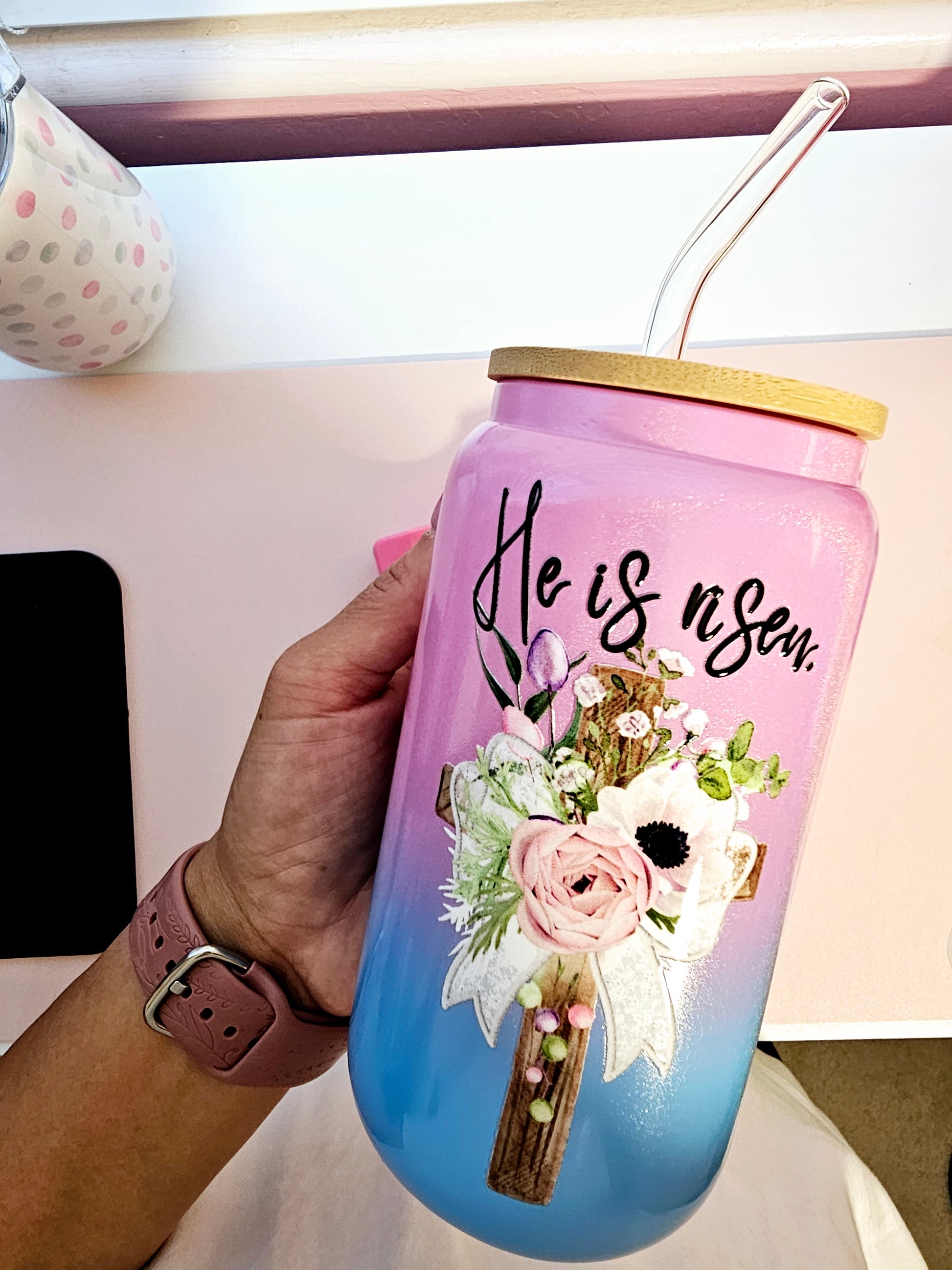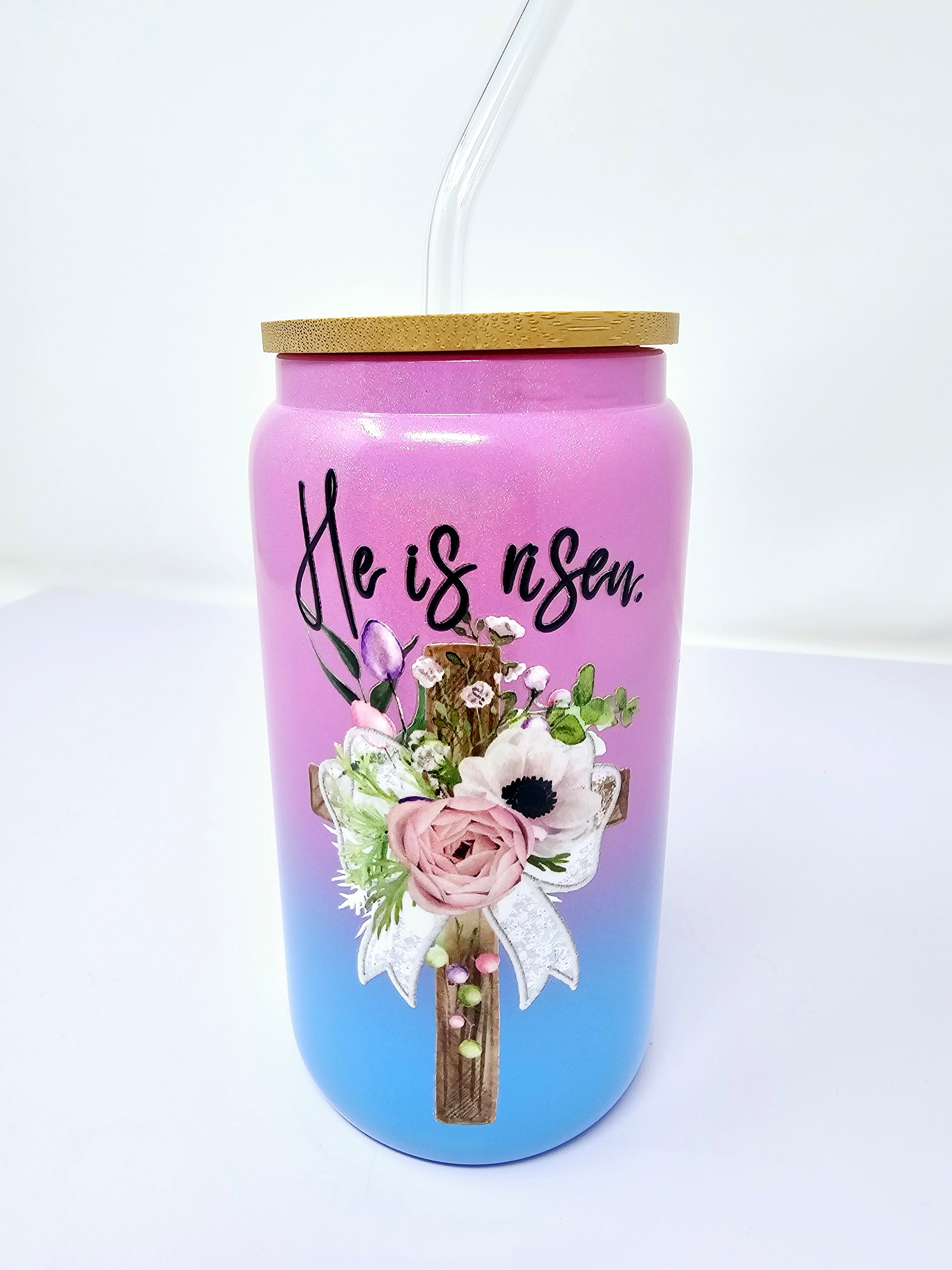 These glass cans are decorated with UVDTF, a highly durable decal that is water resistant and very durable with proper care.