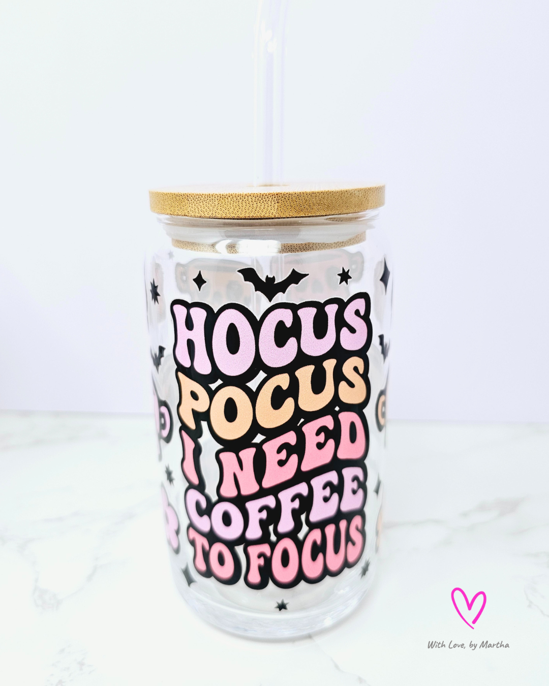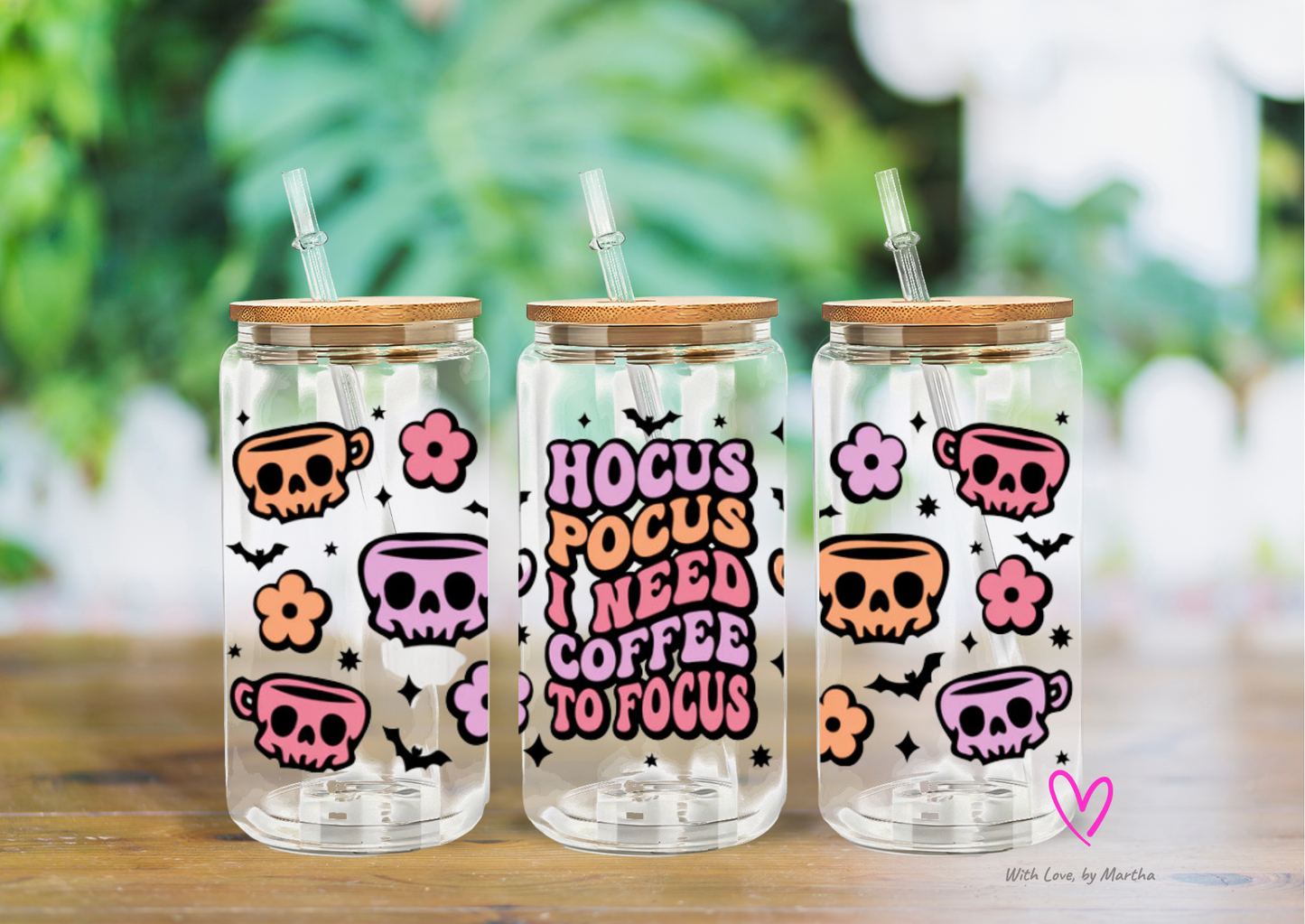 "Hocus Pocus, I need Coffee to Focus" Glass Can 16oz