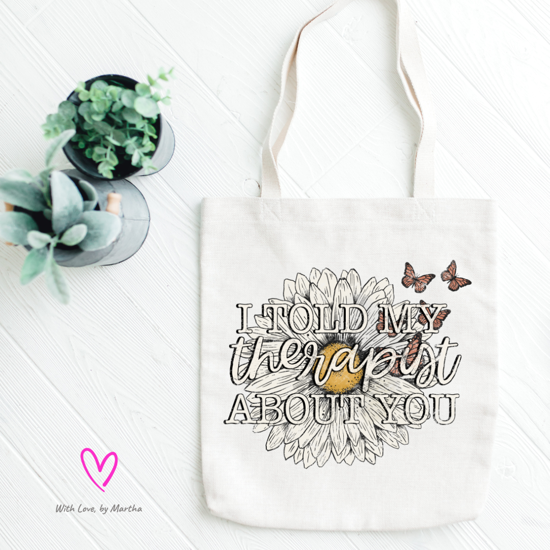 I told my therapist abut you. These are super cute cotton totes measuring 16x15."