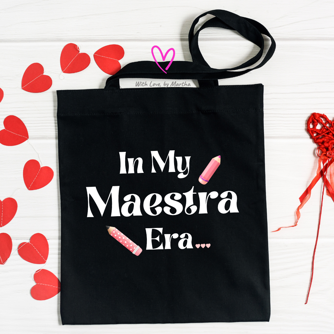 These are super cute cotton totes measuring 16x15." "In my maestra era" means "In my Teacher era."