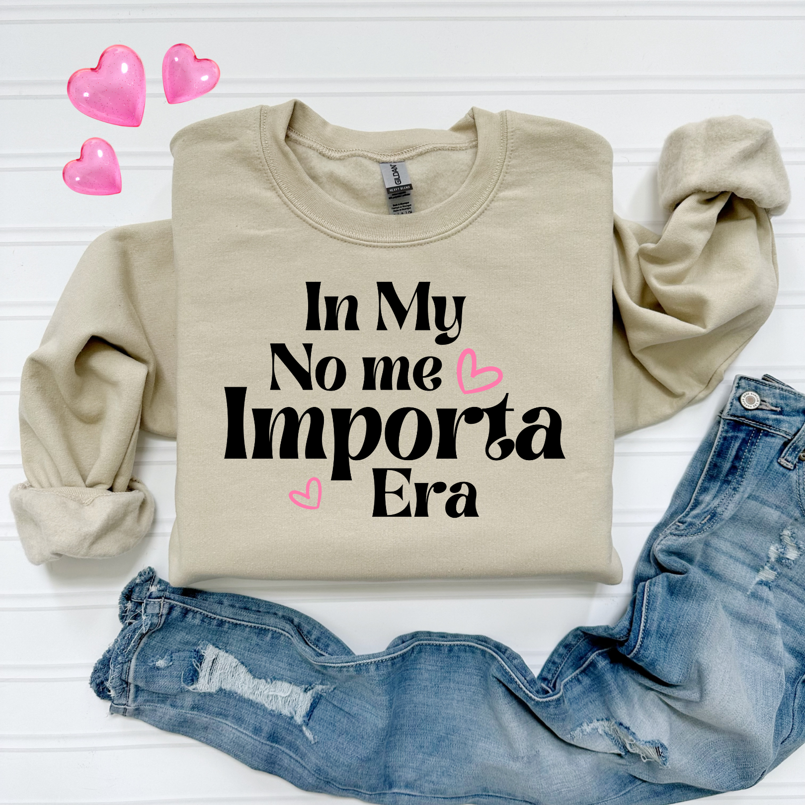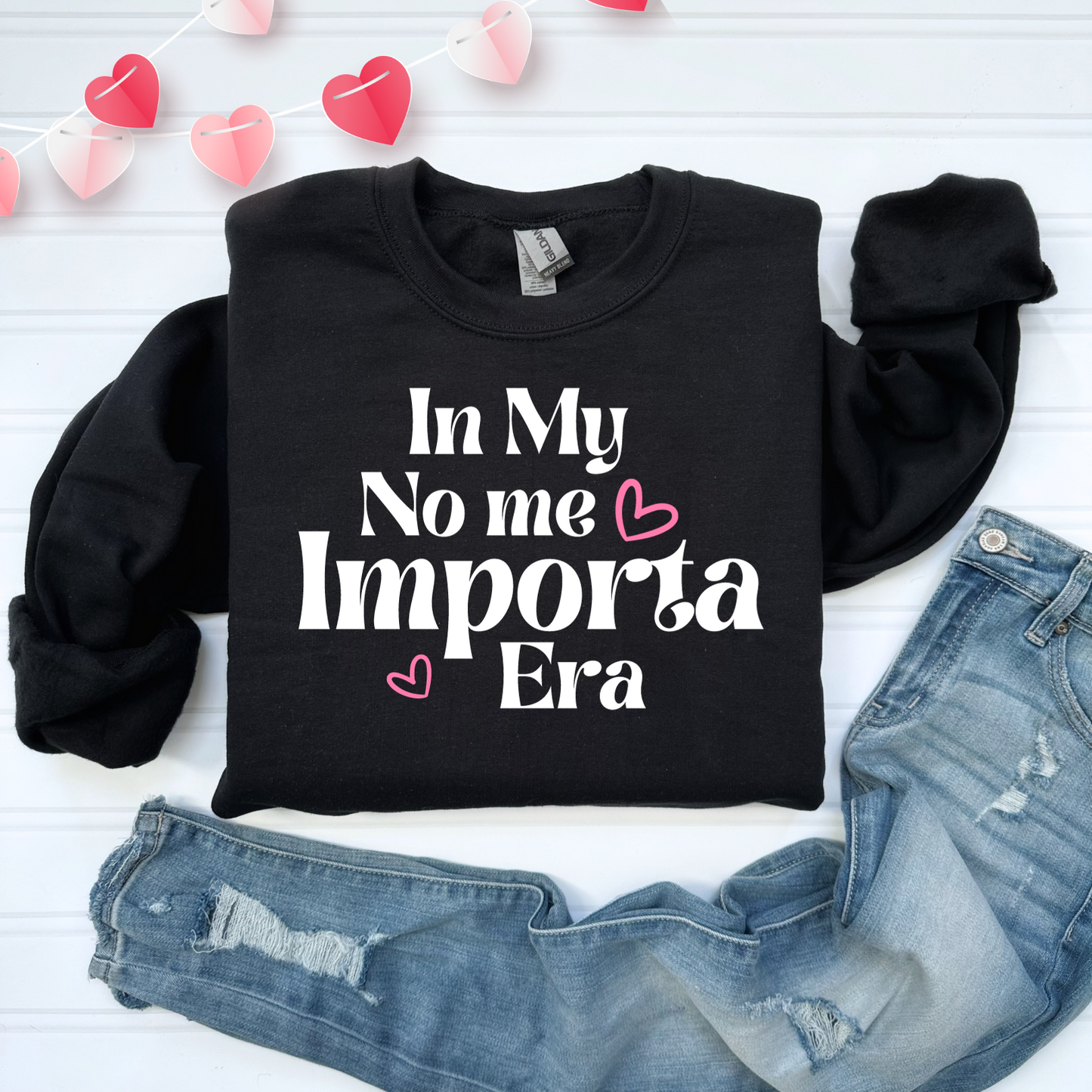 The No Me Importa Era design on the front adds a bold statement look that's sure to turn heads. Available in both sweatshirt and hoodie styles, you can choose the style that best fits your needs.