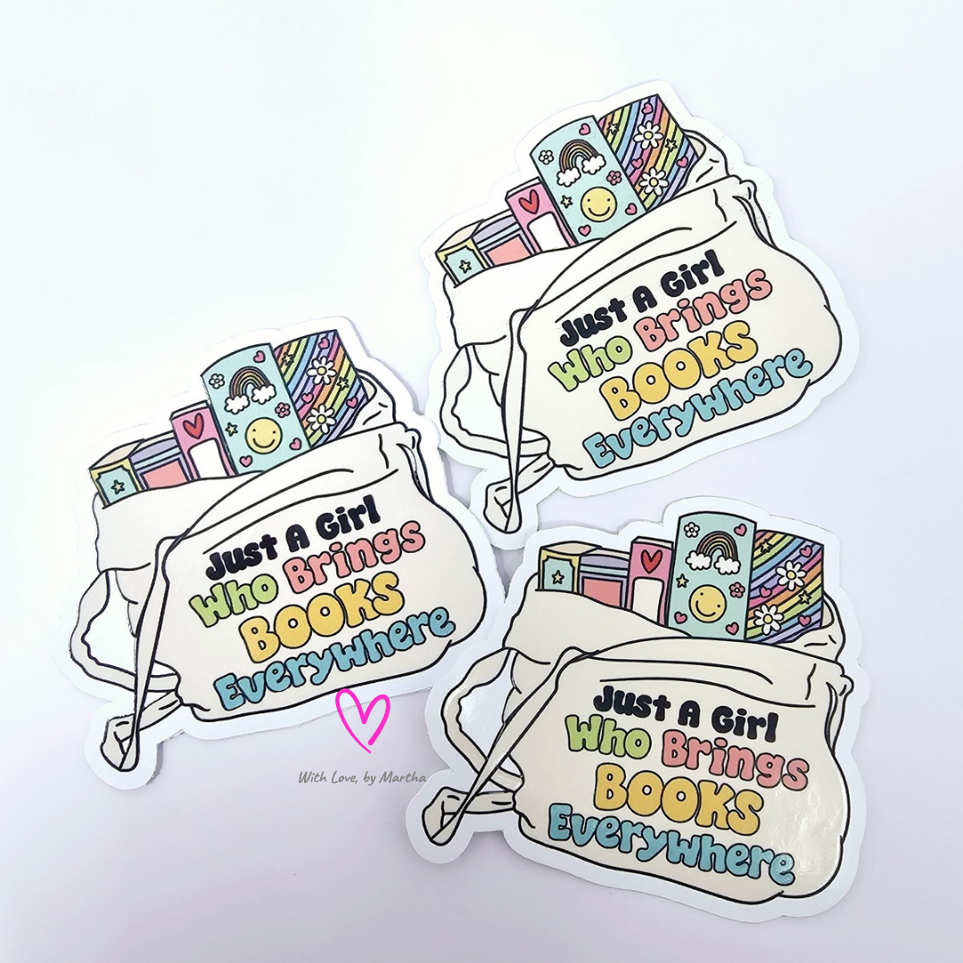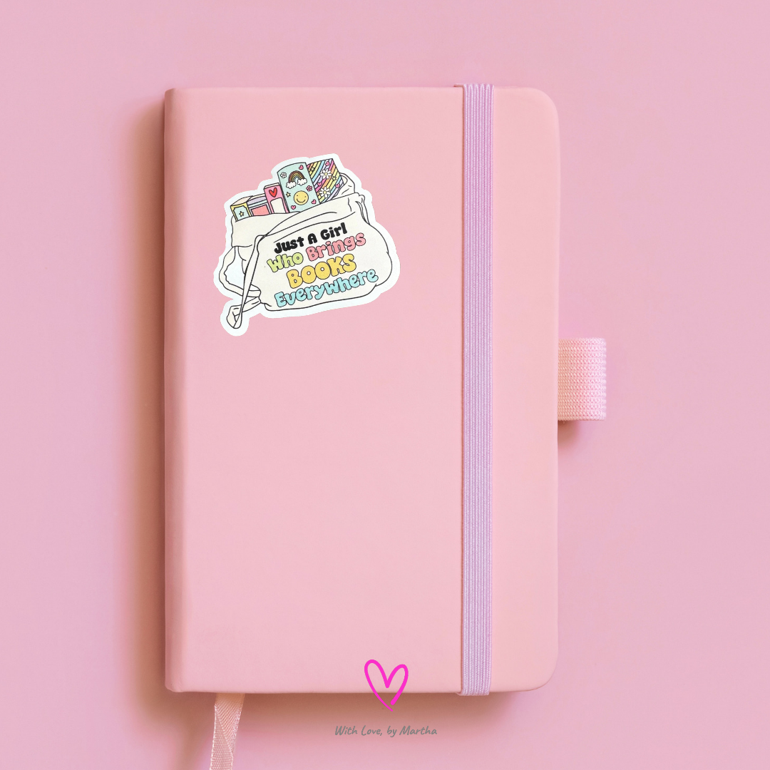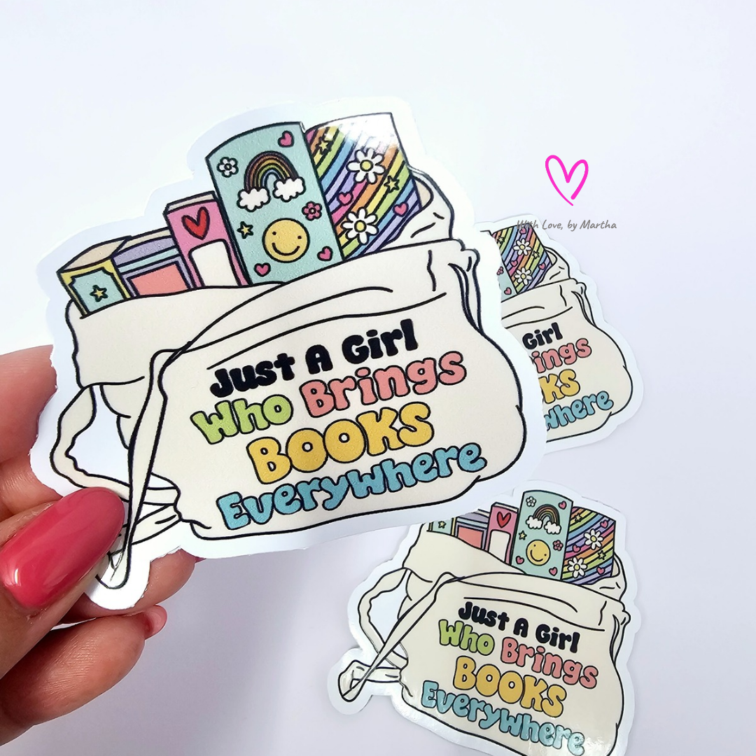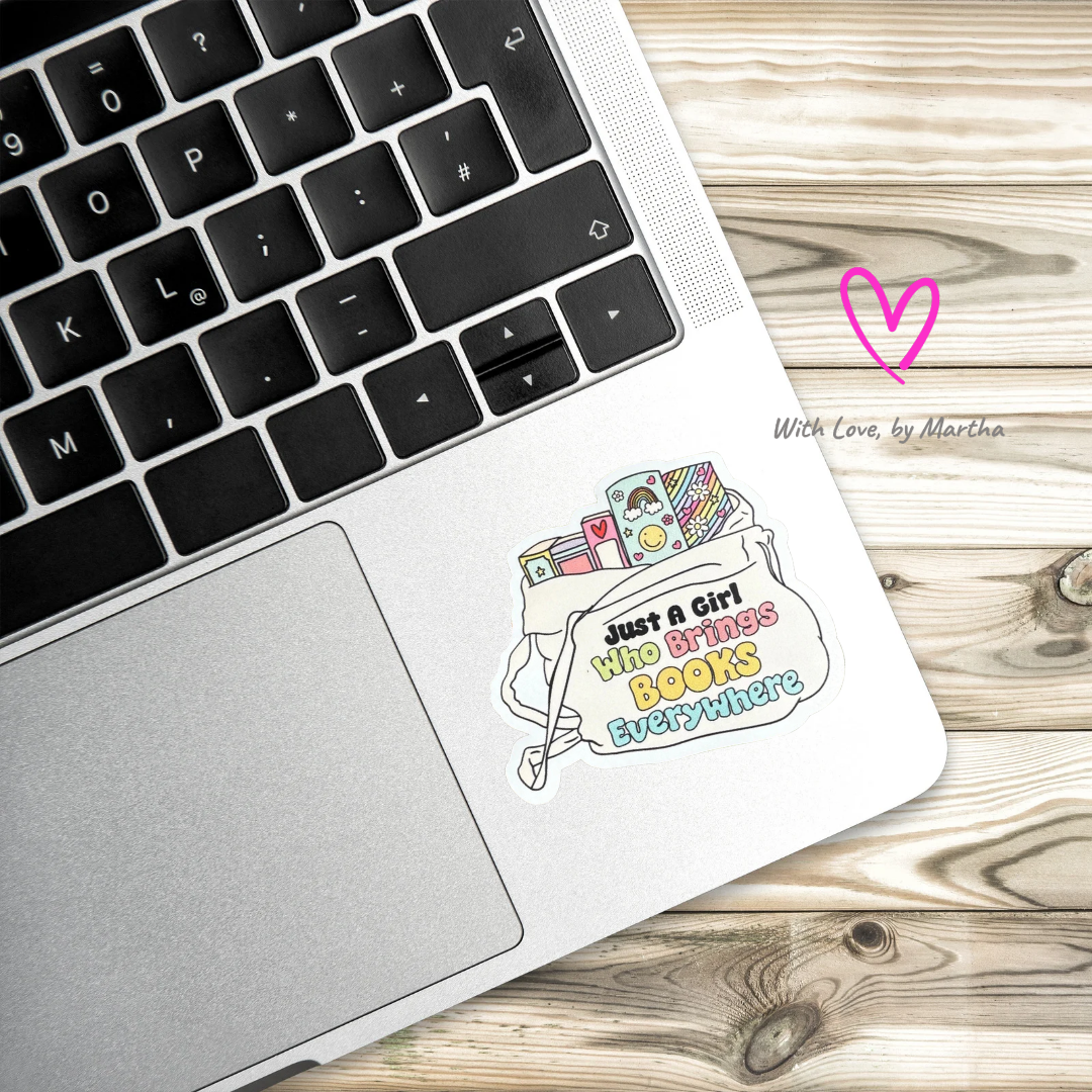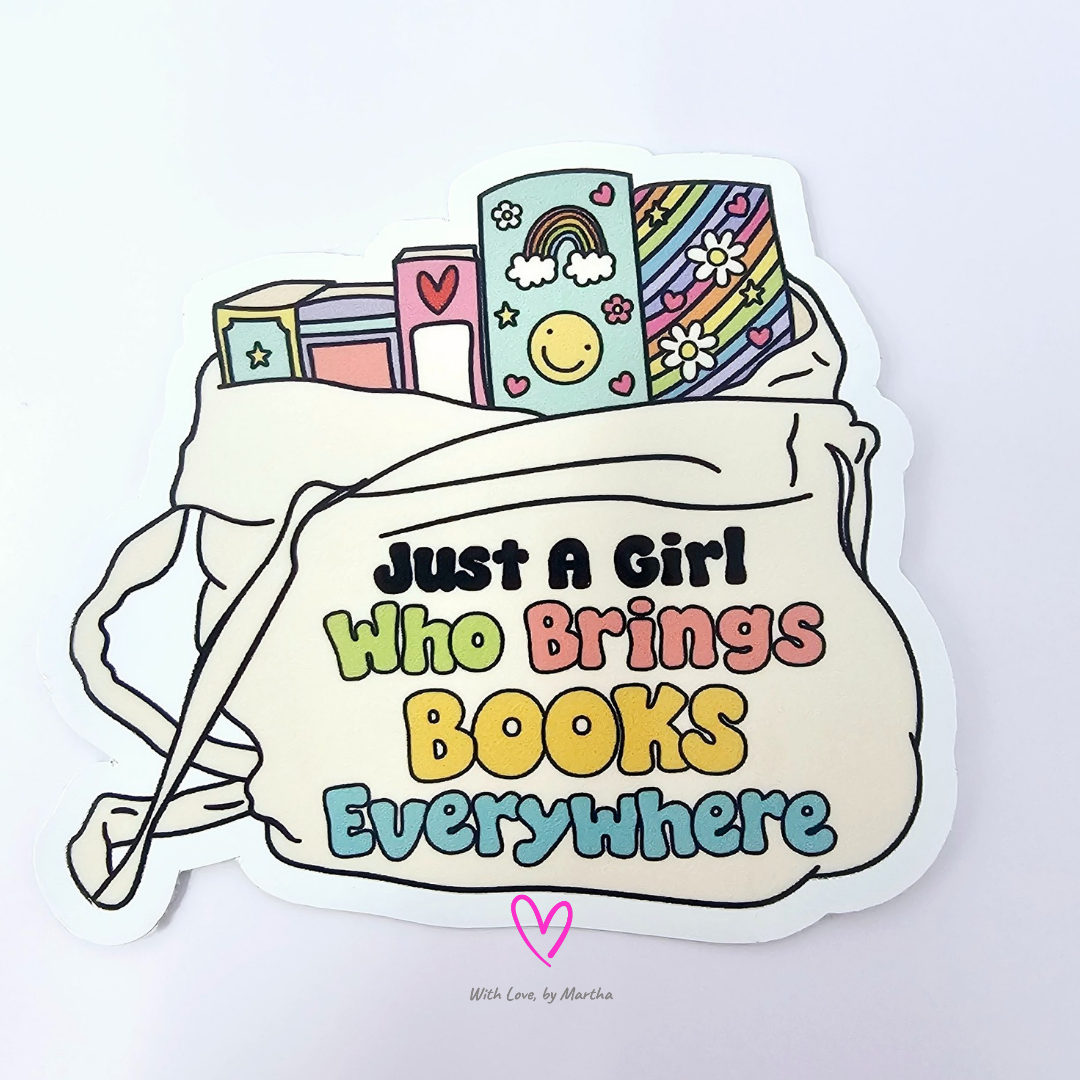 This is a vinyl sticker that reads "Just a girl who brings books everywhere."