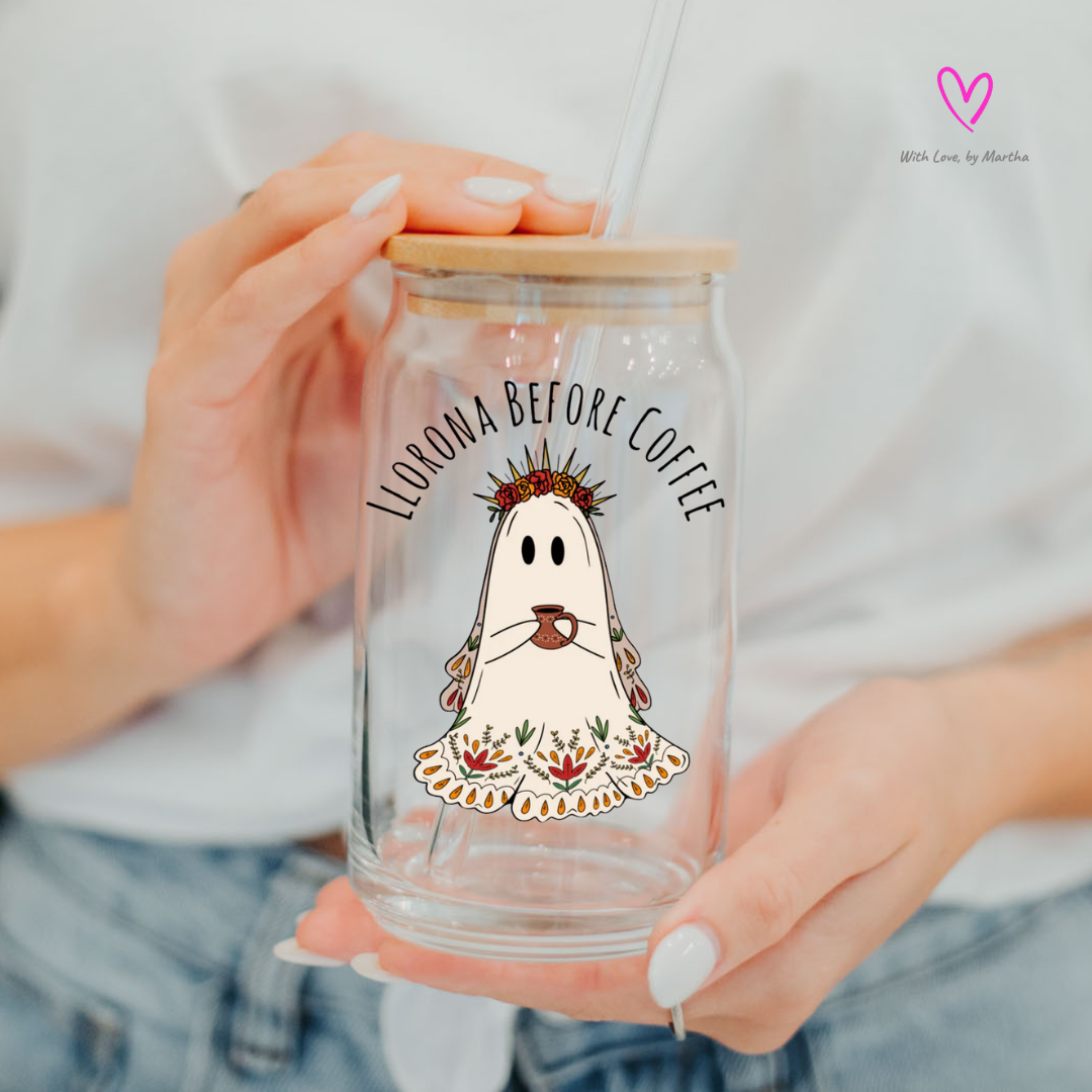 These glass cans are decorated with UVDTF, a highly durable decal that is water resistant and very durable with proper care.