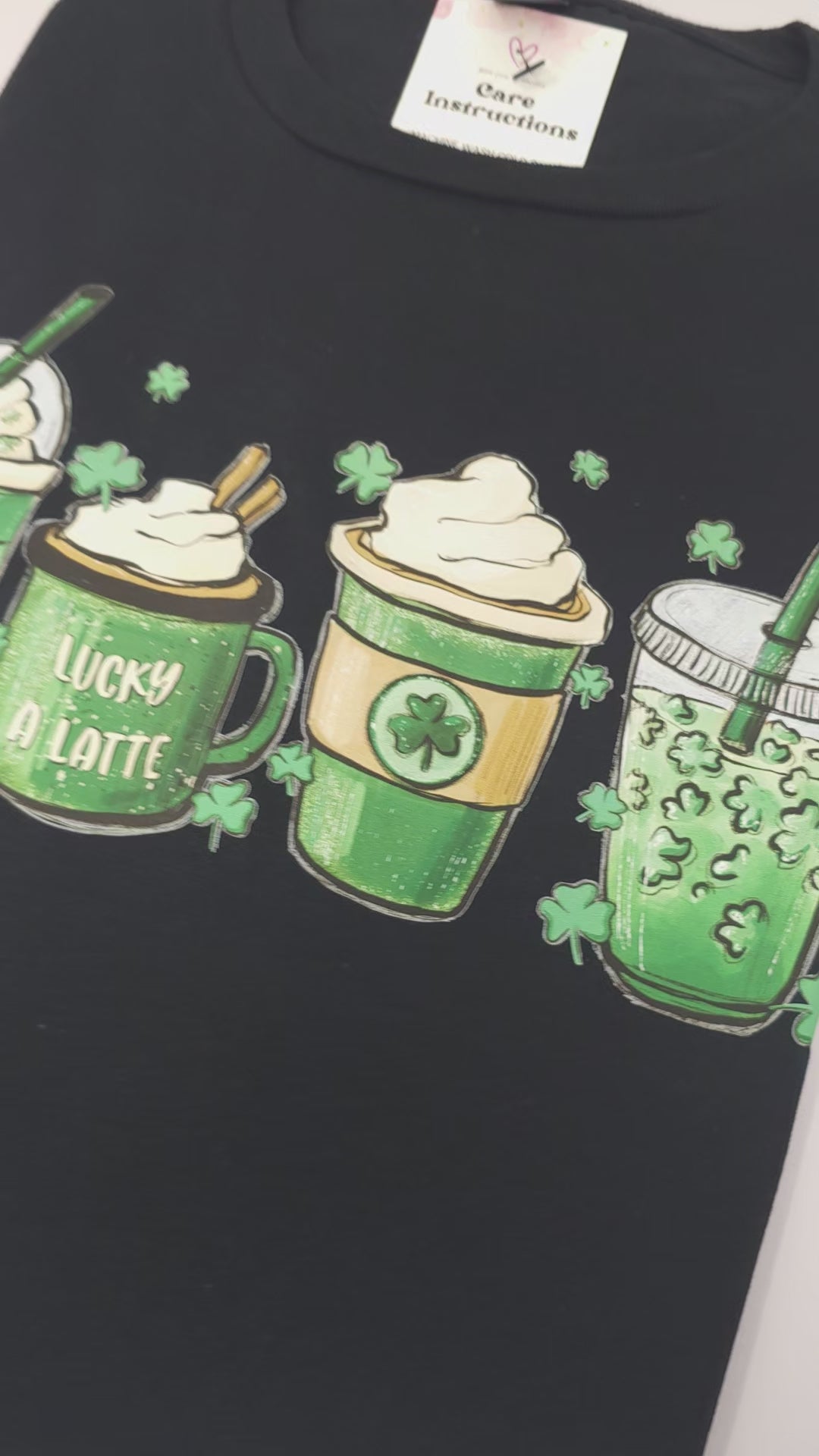 Lucky a latte T-Shirt ☘️ T-Shirt.  This design appears to be embroidered, but instead, it is screen printed.