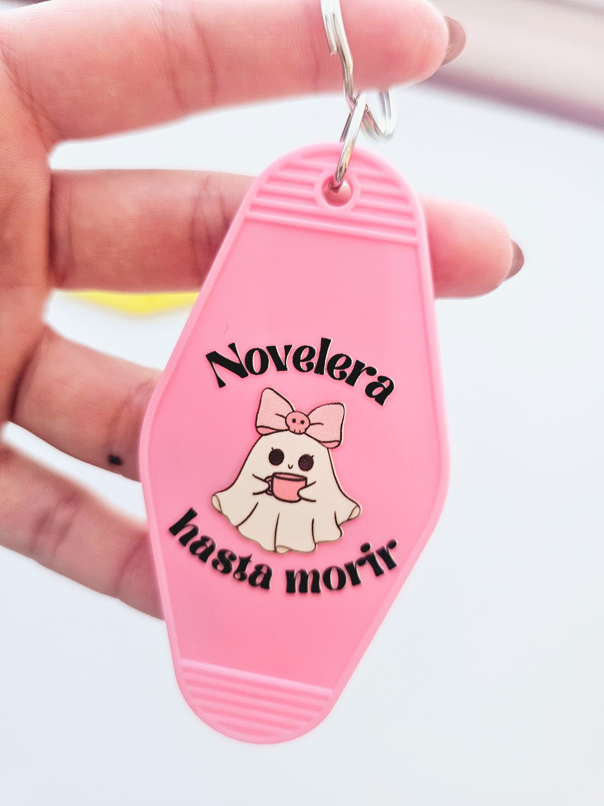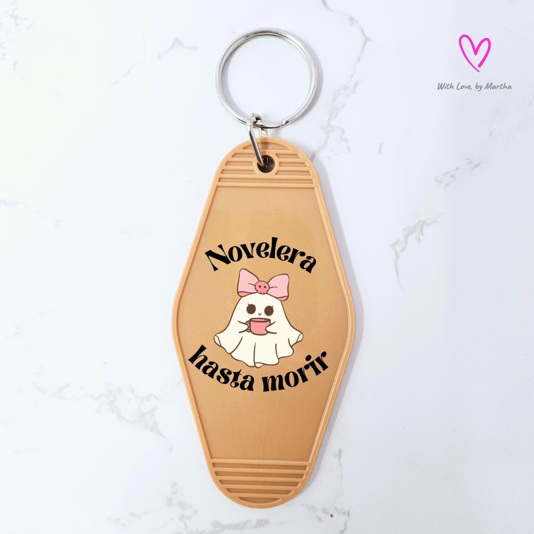 Novelera Hasta Morir keychain. These fun, unique and handcrafted keychains are superlight weight, made of plastic with a durable permanent UV adhesive design. Each hotel keychain measures approx. 3.5 by 2 inches.