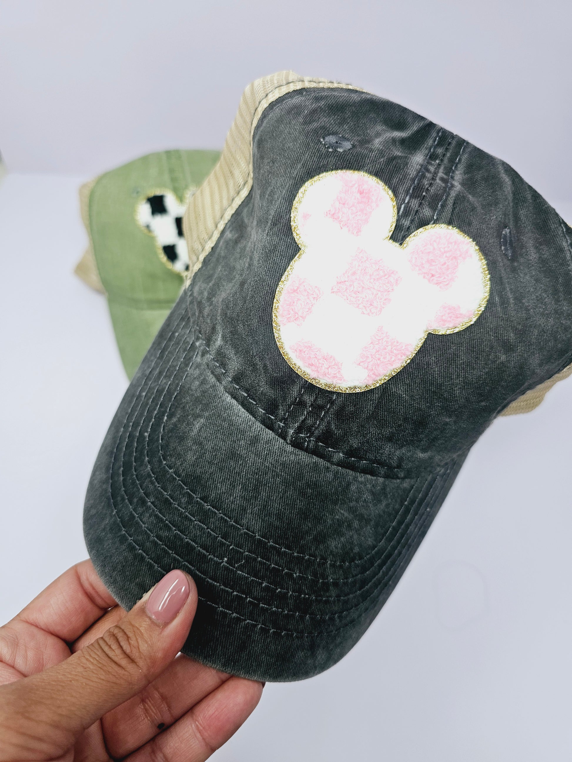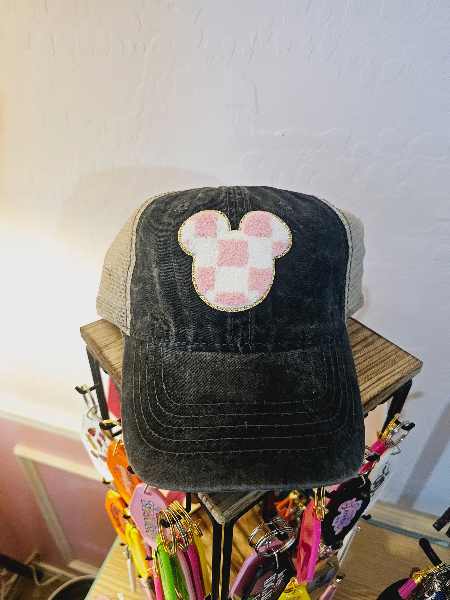 For your next disney trip, this mickey inspired hat is perfect for you. It has a pink and white checkered mouse head on the front of this faded gray and beige mesh trucker hat.