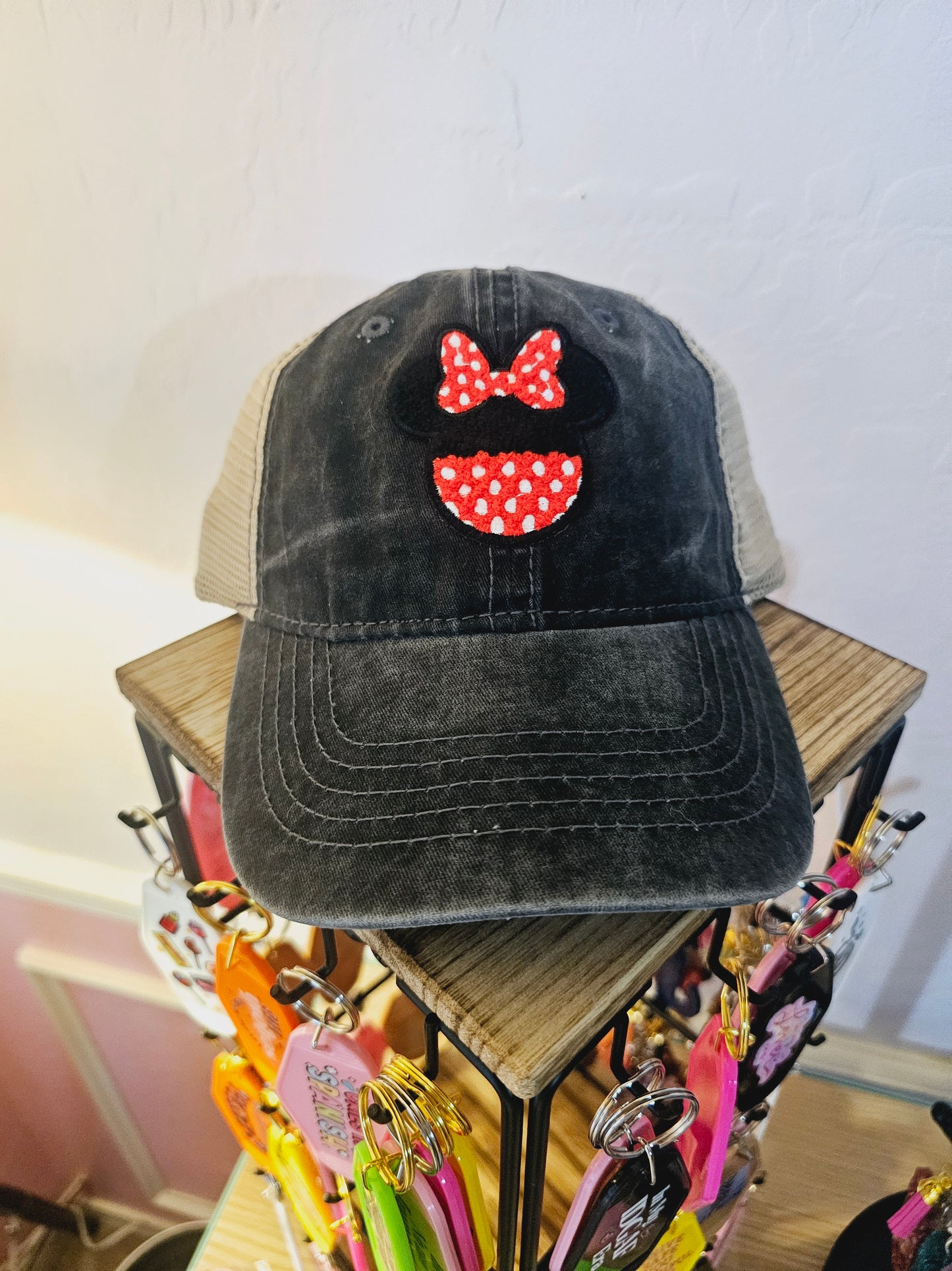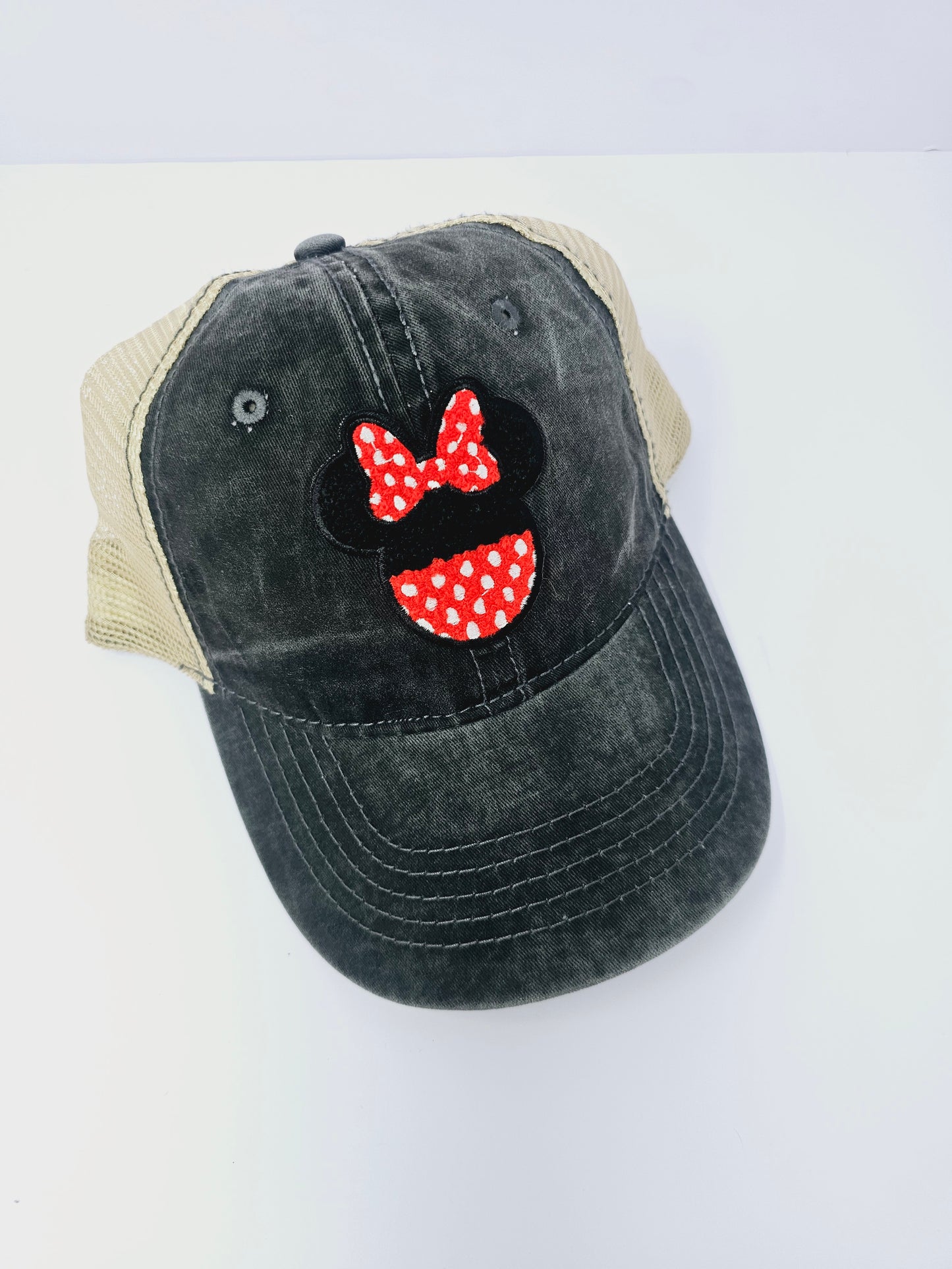 For your next disney trip, this inspired hat is perfect for you. It has a red and black polka dot minnie mouse head on the front of this faded light black and beige mesh trucker hat.
