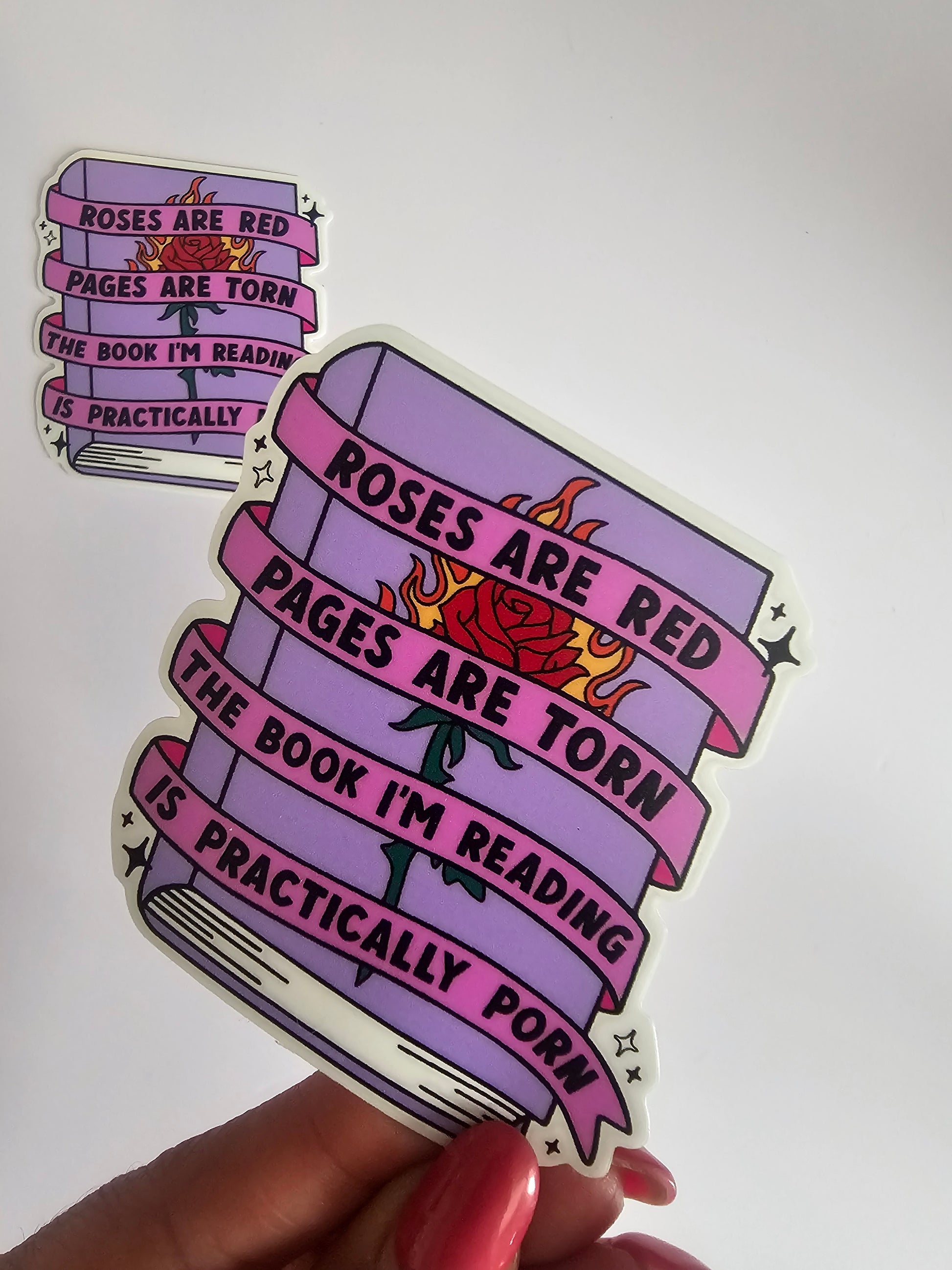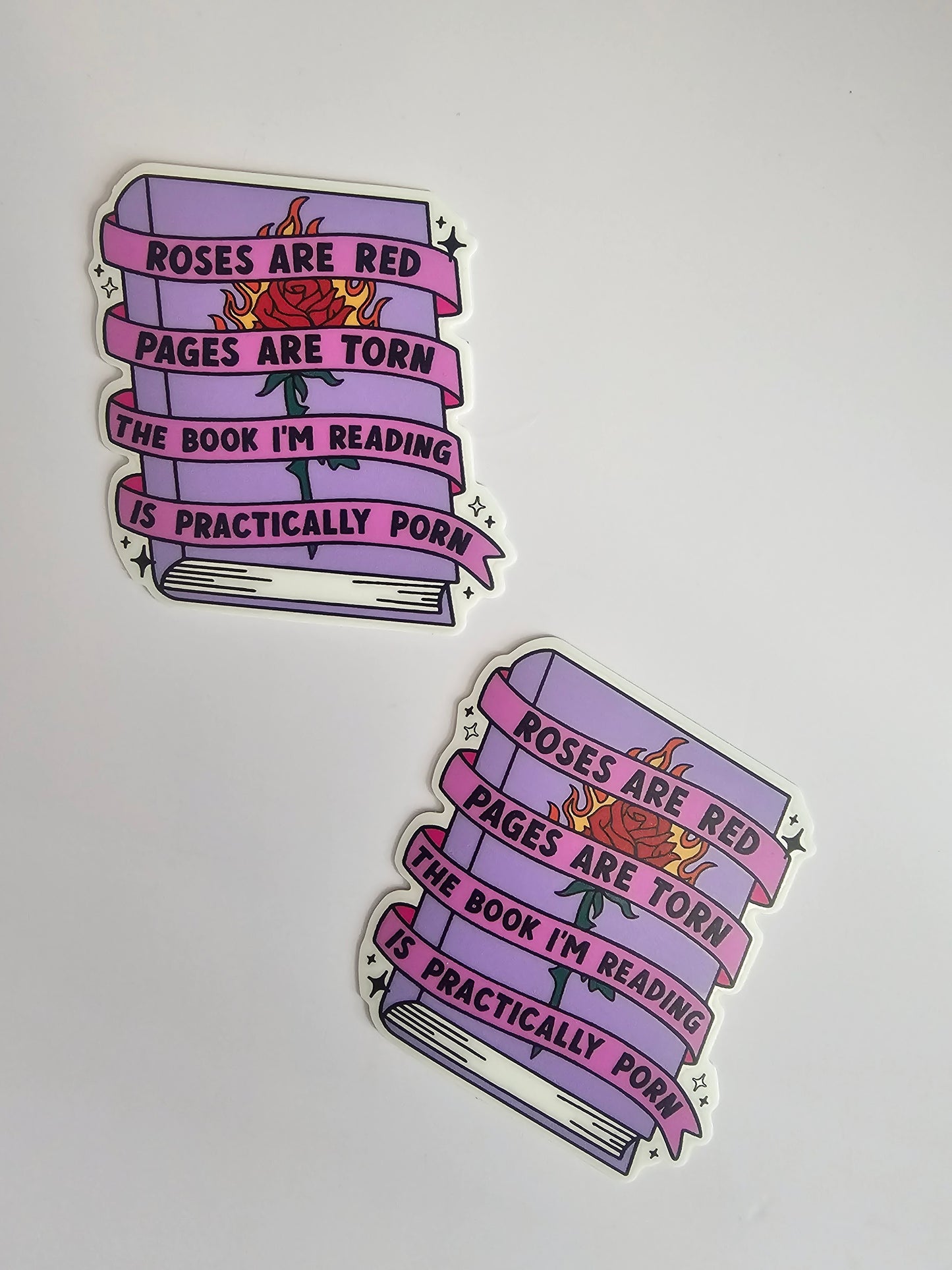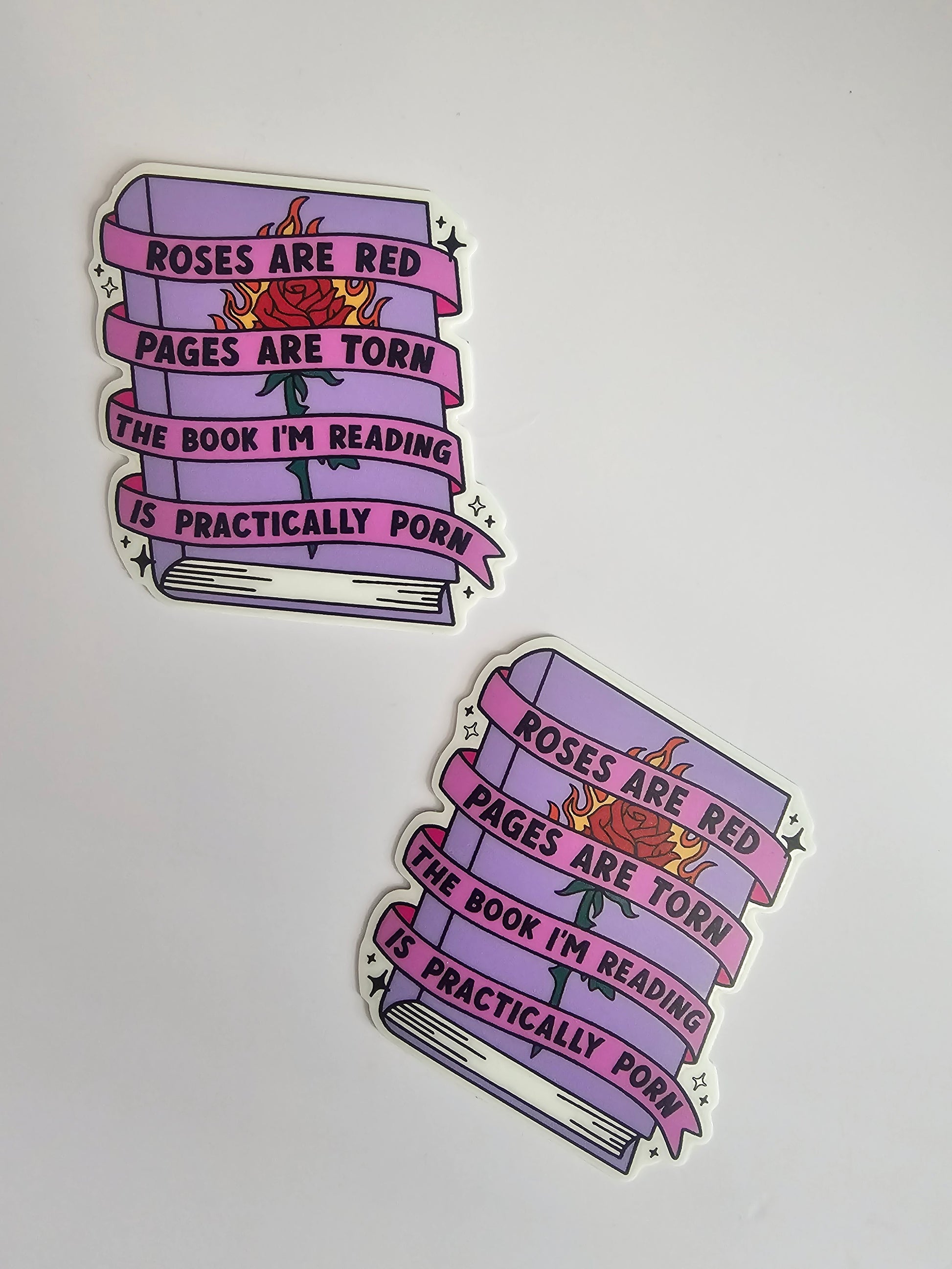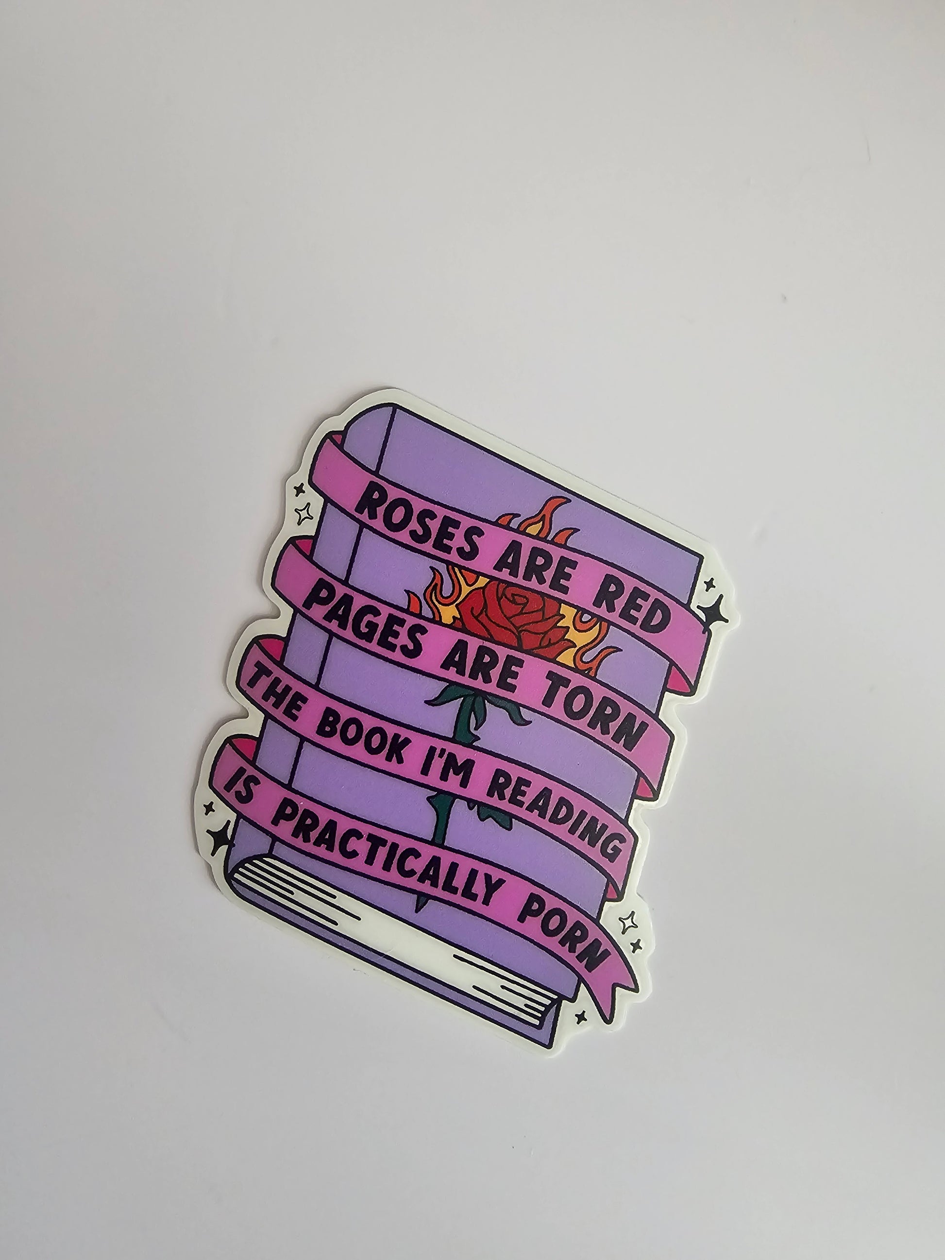 This is a vinyl sticker that reads "Roses are red pages are torn the book I'm reading is practically porn."