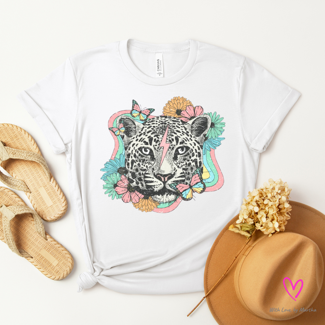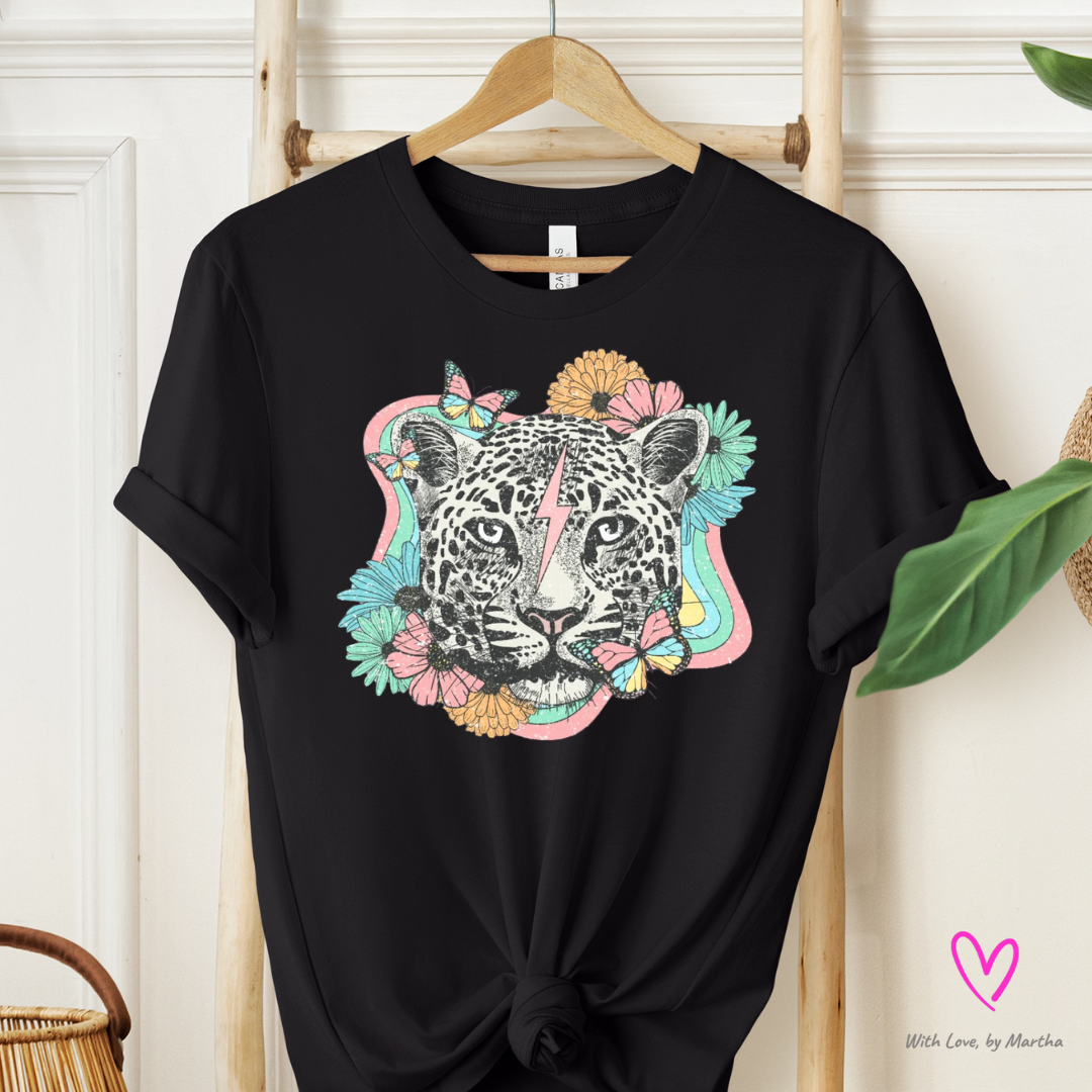 The Snow Leopard in retro and floral vibes. This T-shirt is special