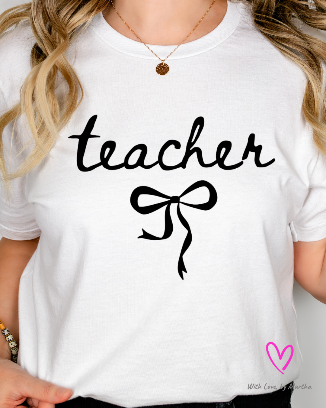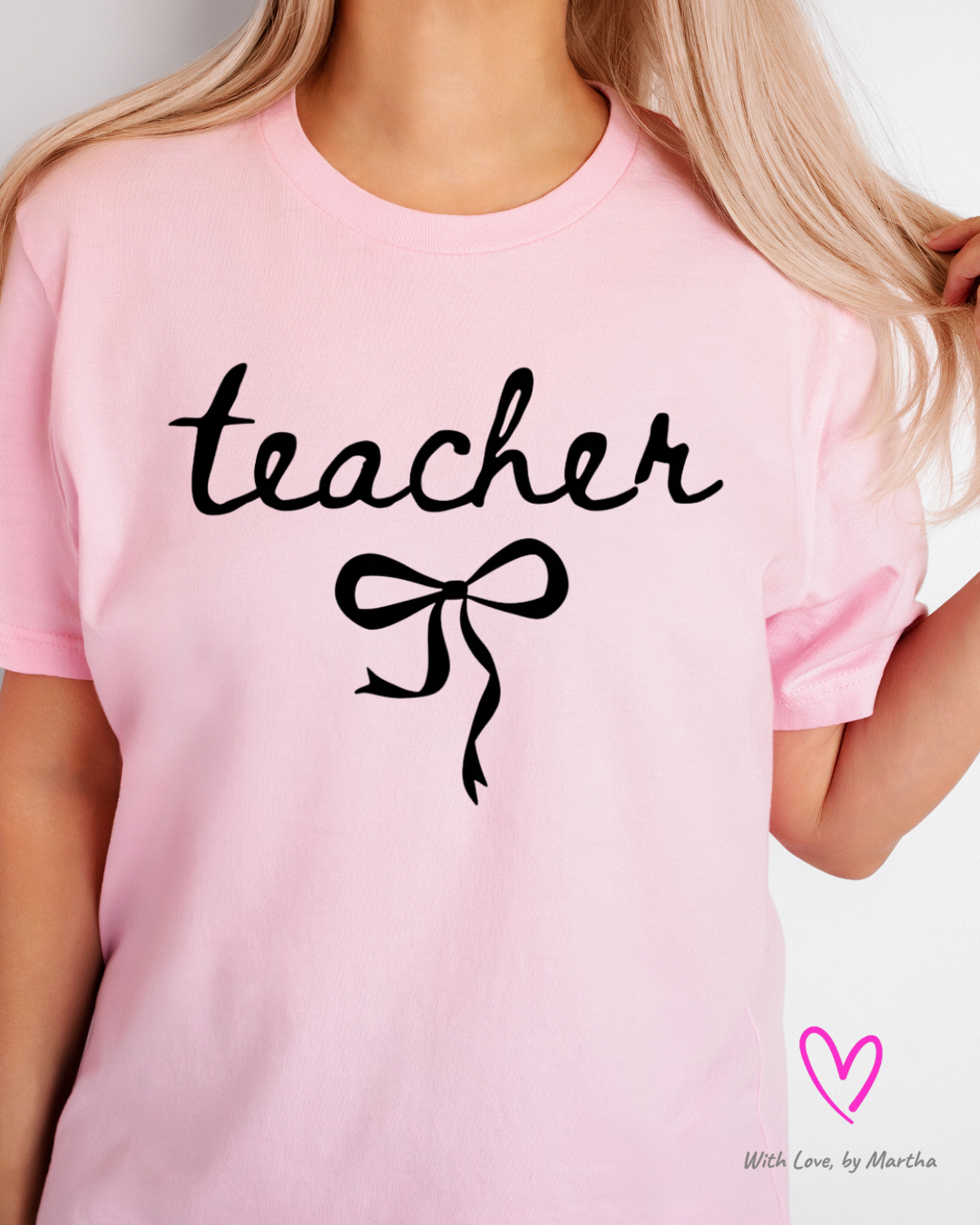 This is a cute t-shirt that makes a great gift for a teacher, or a graduating senior studying education or about to become a teacher. It has a coquette trendy style, with the word teacher in cursive and a cute bow.