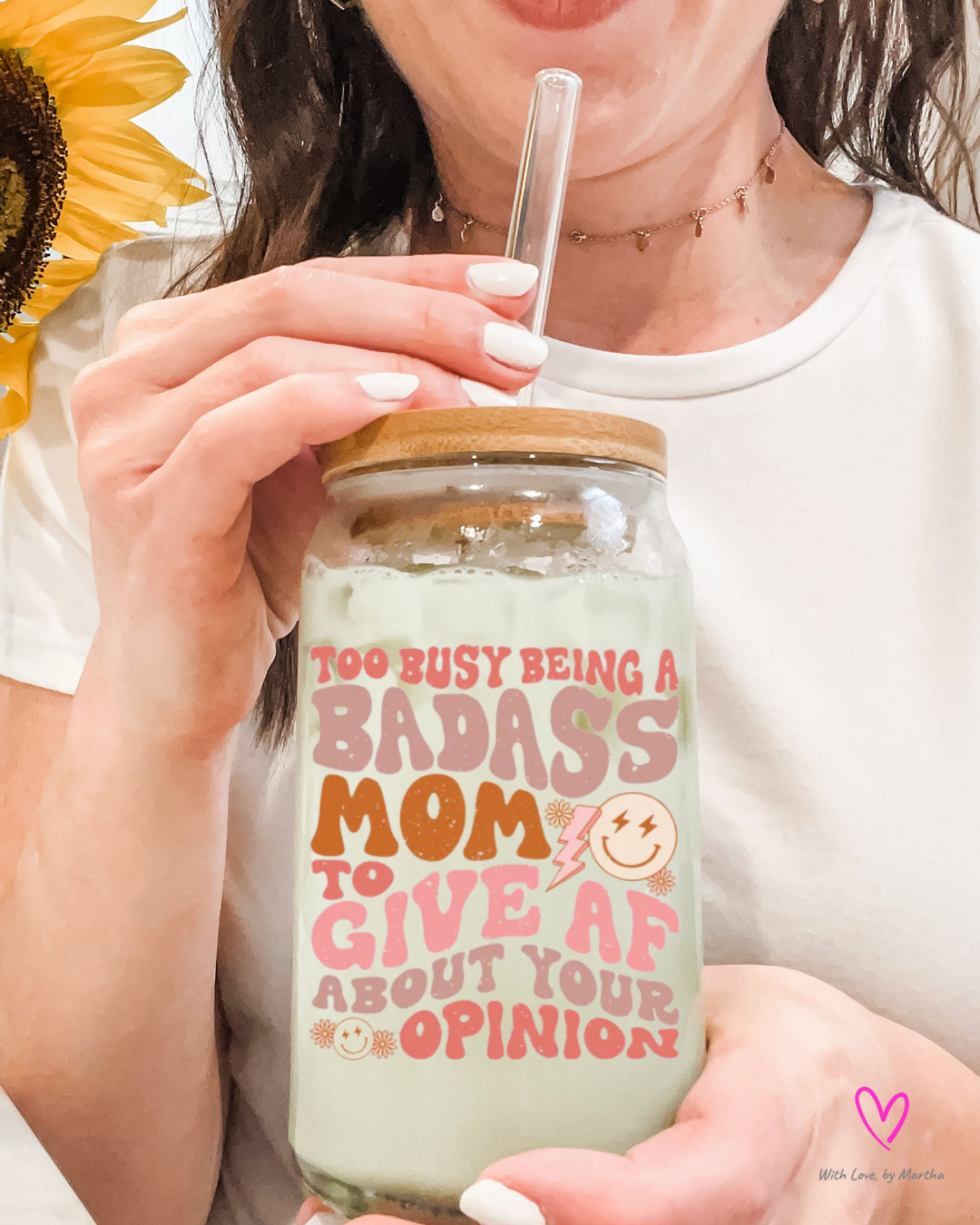 Too busy being a BADASSmom to give AF about your opinion" Glass cup 16oz