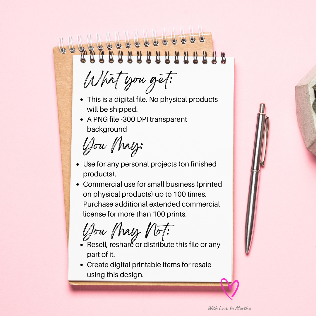 You'll get a PNG file - 300 dpi transparent background, in white, and another in black.
