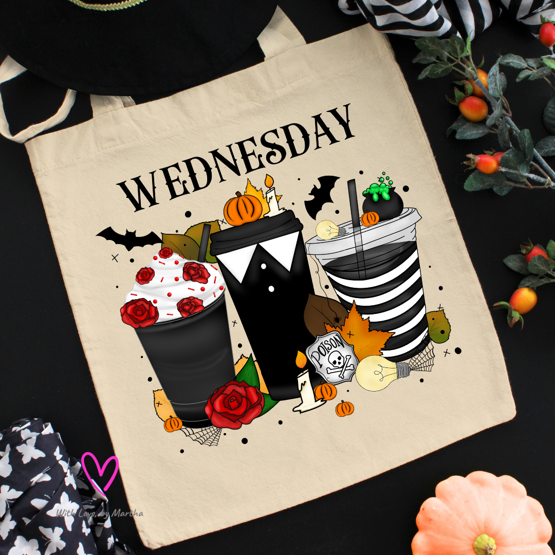 Wednesday cups. These are super cute cotton totes measuring 16x15."