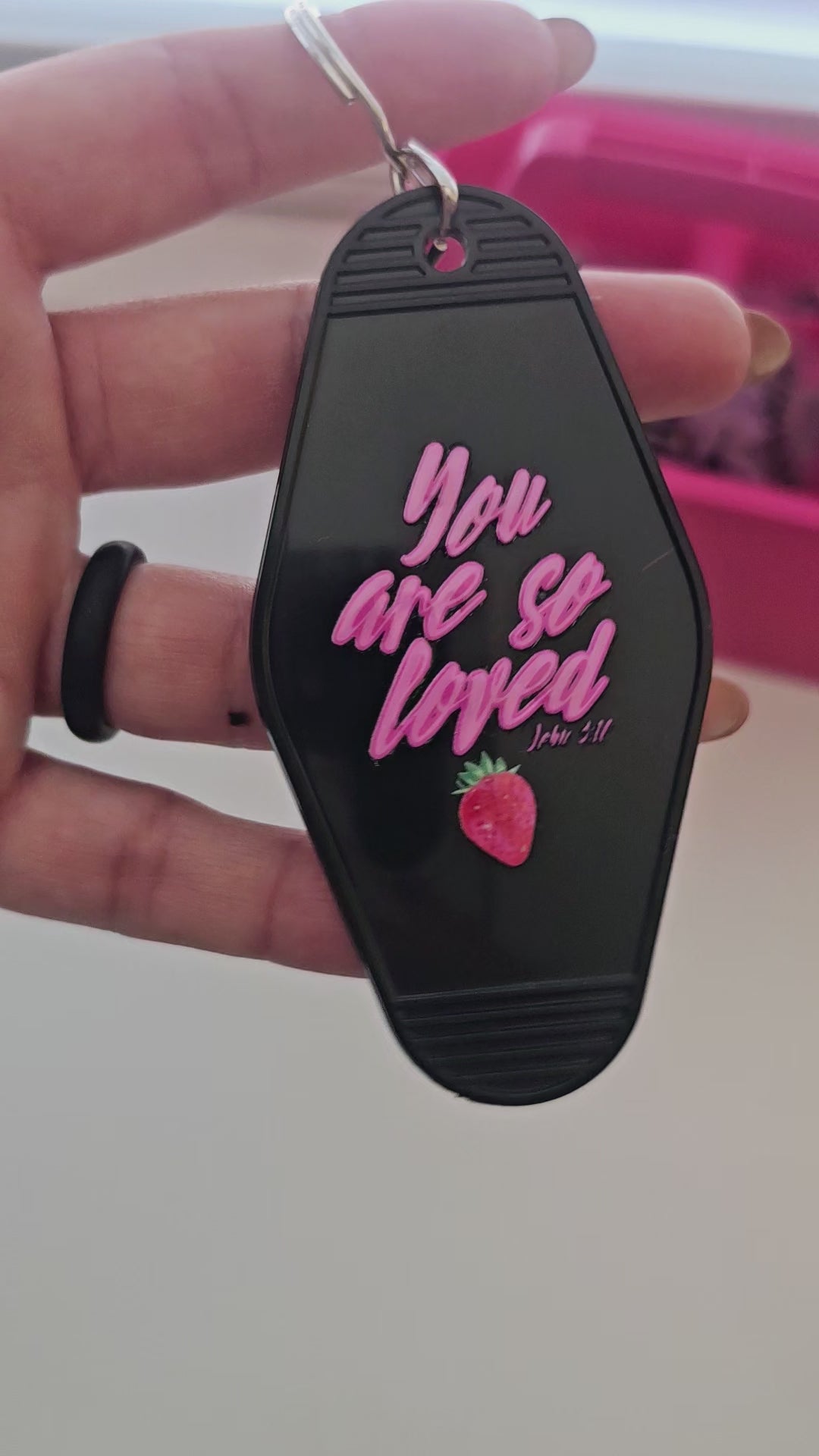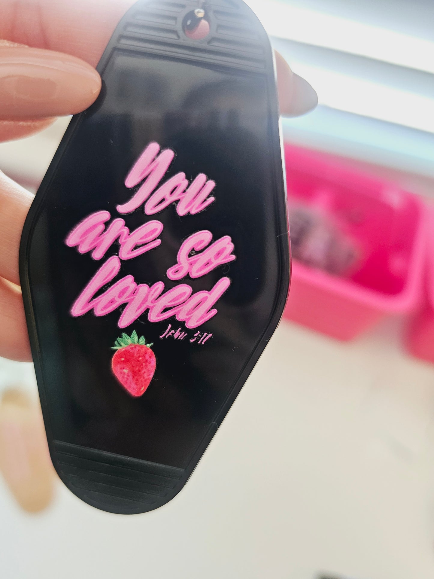 "You are so loved" Motel style keychainsThese fun, unique and handcrafted keychains are superlight weight, made of plastic with a durable permanent UV adhesive design. Each hotel keychain measures approx. 3.5 by 2 inches.